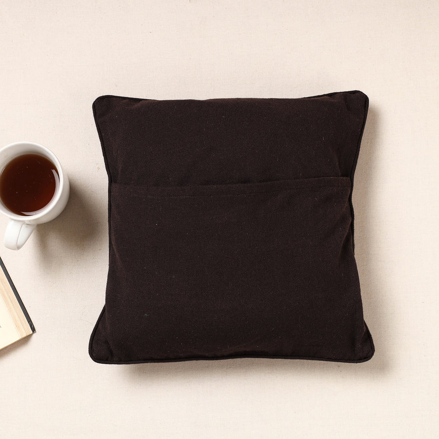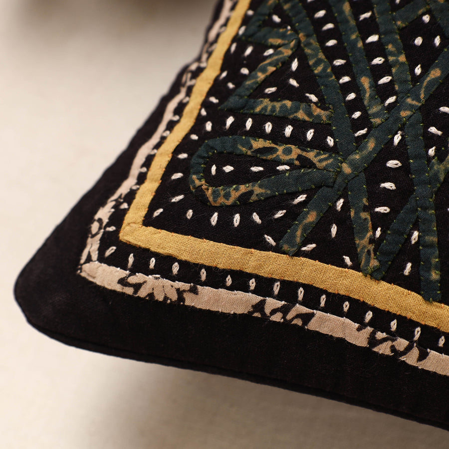 Fine quality black rabari hand embroidery and applique work cotton cushion cover. This cushion cover is made from cotton fabric with beautiful Rabari embroidery and applique work by artisans of Kala Raksha. Rabari embroidery is unique to the nomadic Rabaris. Essential to Rabari embroidery is the use of mirrors in a variety of shapes. Rabaris outline patterns in chain stitch, then decorate them with a regular sequence of mirrors and accent stitches, in a regular sequence of colors. Rabaris also use decorative back stitching, called bakhiya.