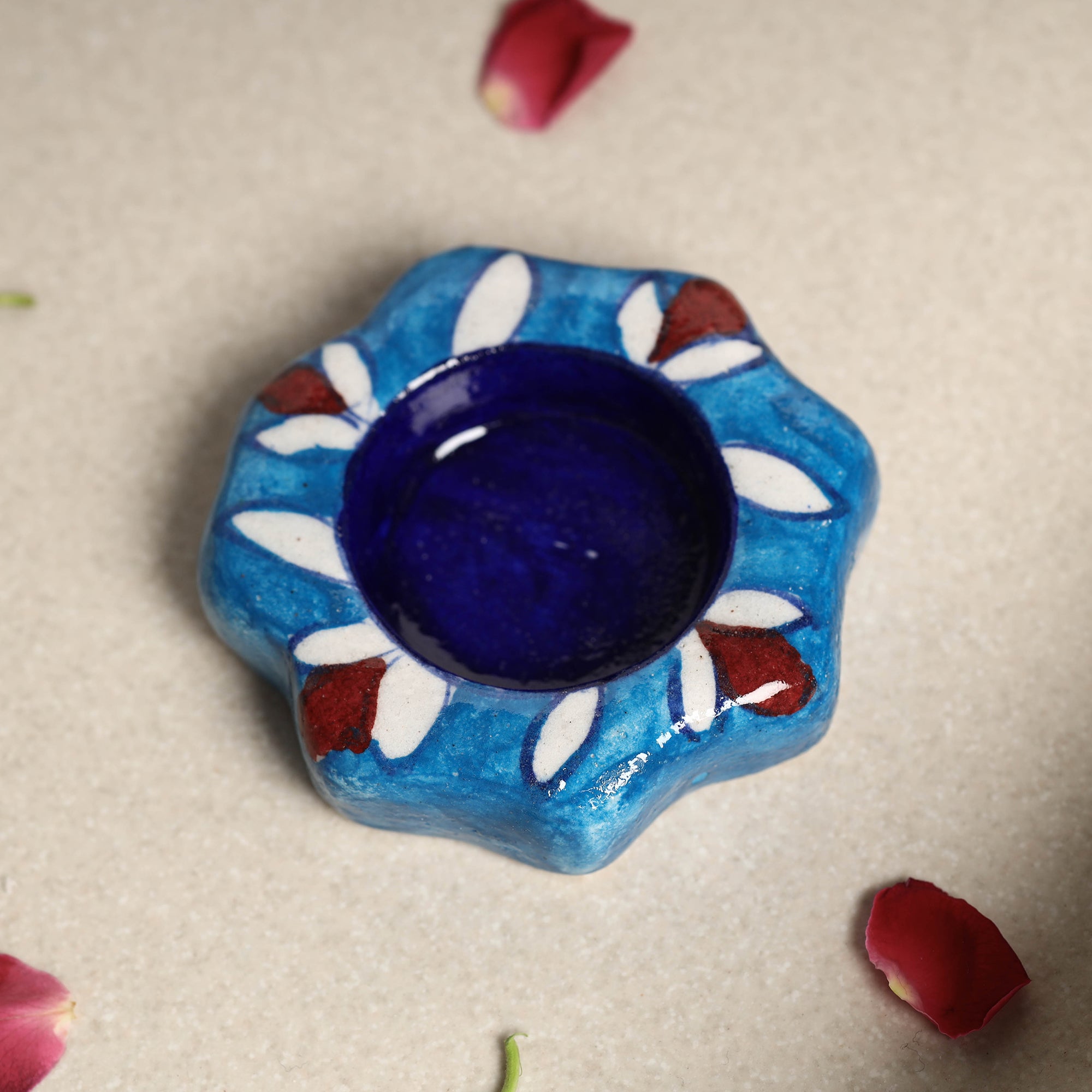 Blue handcrafted blue pottery ceramic tealight candle holder. This beautiful tealight holder can light up any place of your house. Whether it be your dining table or your dressing table. Also a great add on at any party. It looks very beautiful just as it is or even along side your Trivets.