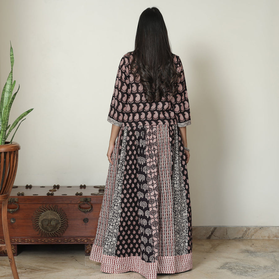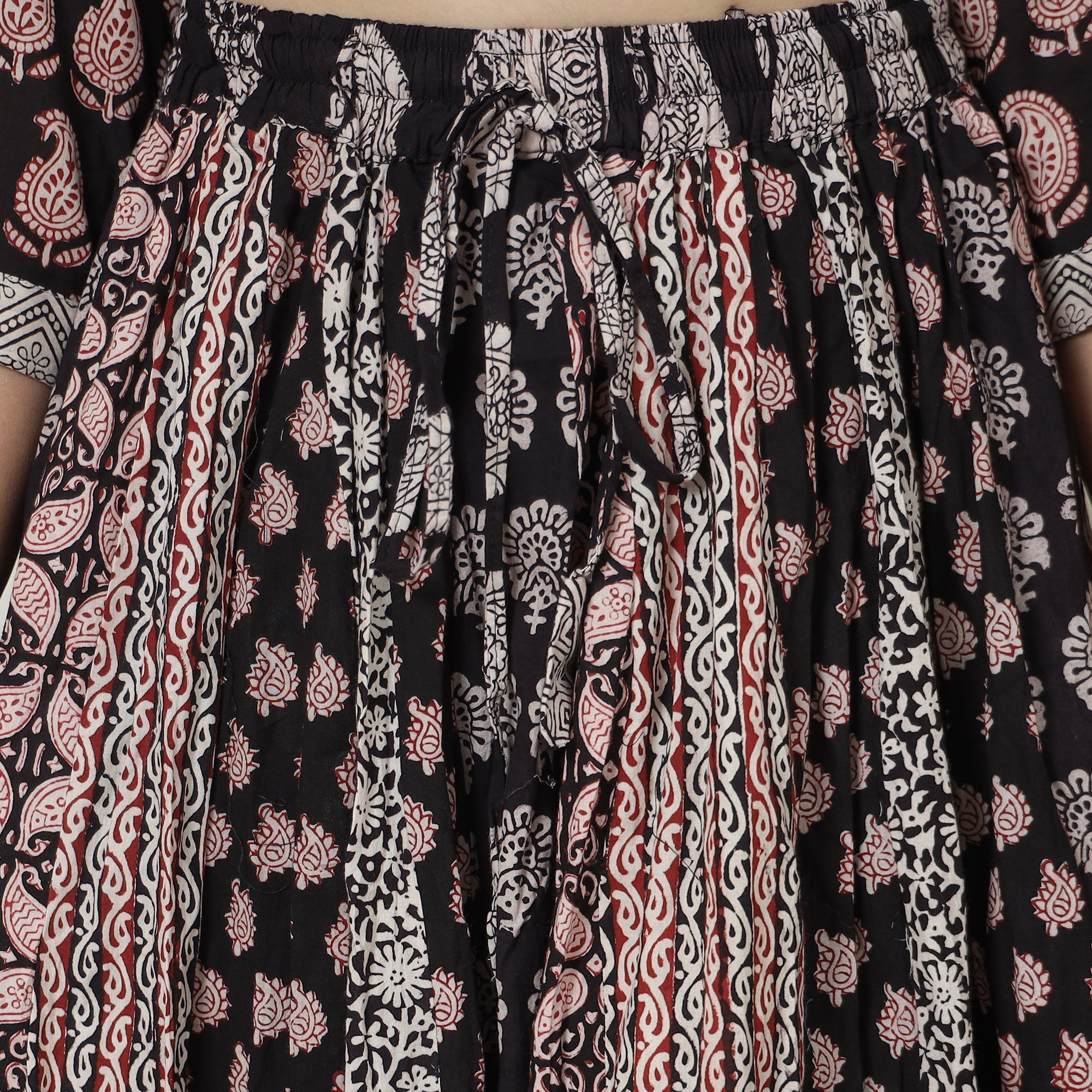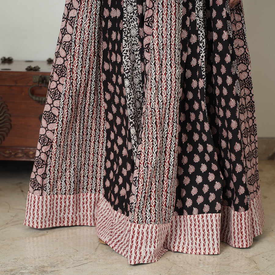 This exquisite patchwork cotton long skirt is crafted from bagh block-printed, natural-dyed cotton fabric. This skirt boasts a waist tie-up closure, allowing for a customized and comfortable fit. The patchwork kali design adds a unique touch, showcasing the skilled craftsmanship behind its creation. The natural dyes used in the printing process enhance the overall beauty of the garment. The intricate patterns and vibrant colours reflect the cultural heritage of Gujarat. Perfect for both casual and semi-formal occasions.
