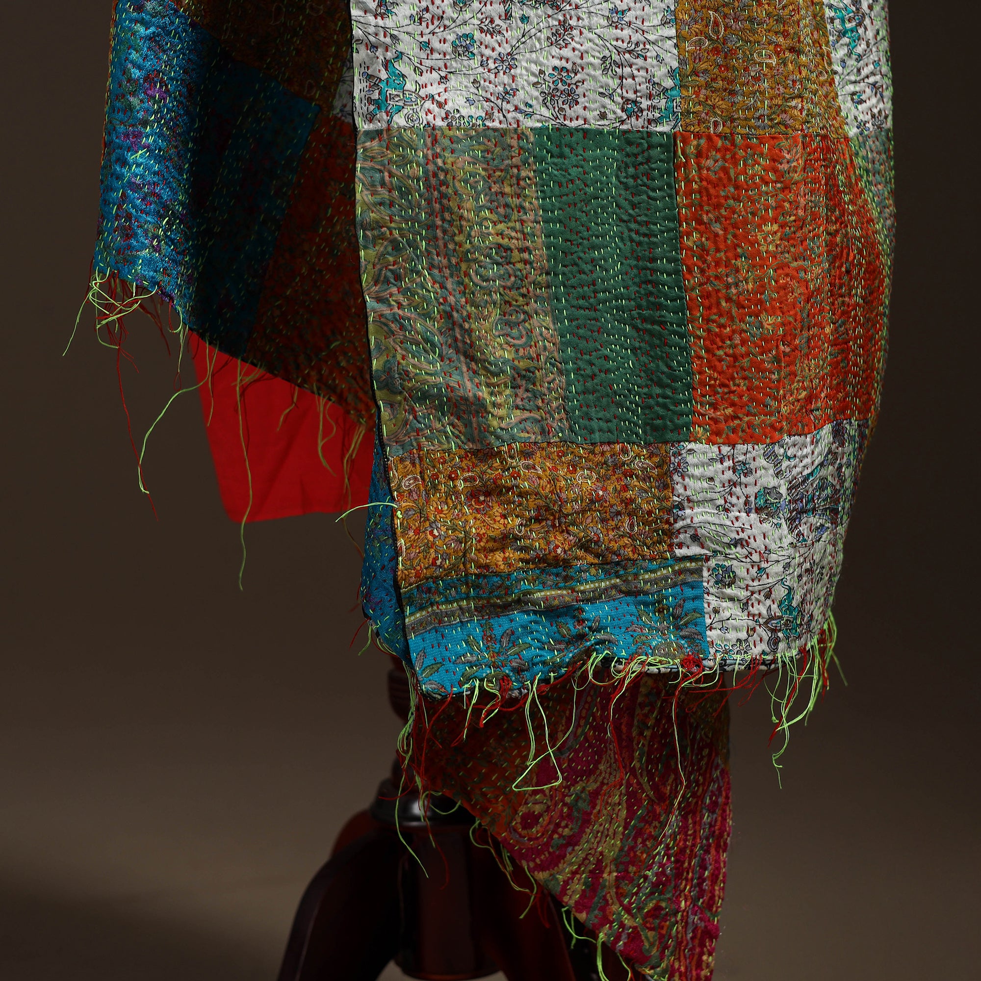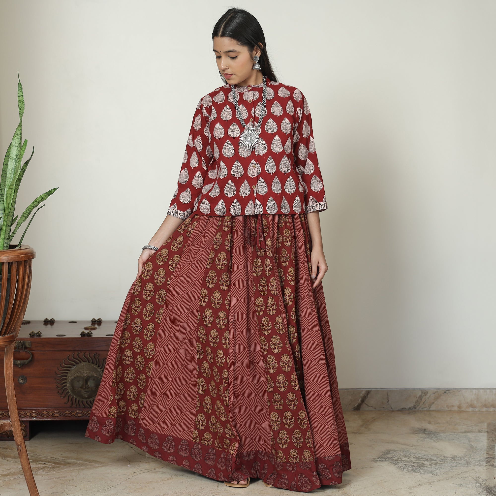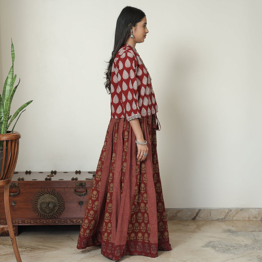 This exquisite patchwork cotton long skirt is crafted from bagh block-printed, natural-dyed cotton fabric. This skirt boasts a waist tie-up closure, allowing for a customized and comfortable fit. The patchwork kali design adds a unique touch, showcasing the skilled craftsmanship behind its creation. The natural dyes used in the printing process enhance the overall beauty of the garment. The intricate patterns and vibrant colours reflect the cultural heritage of Gujarat. Perfect for both casual and semi-formal occasions.