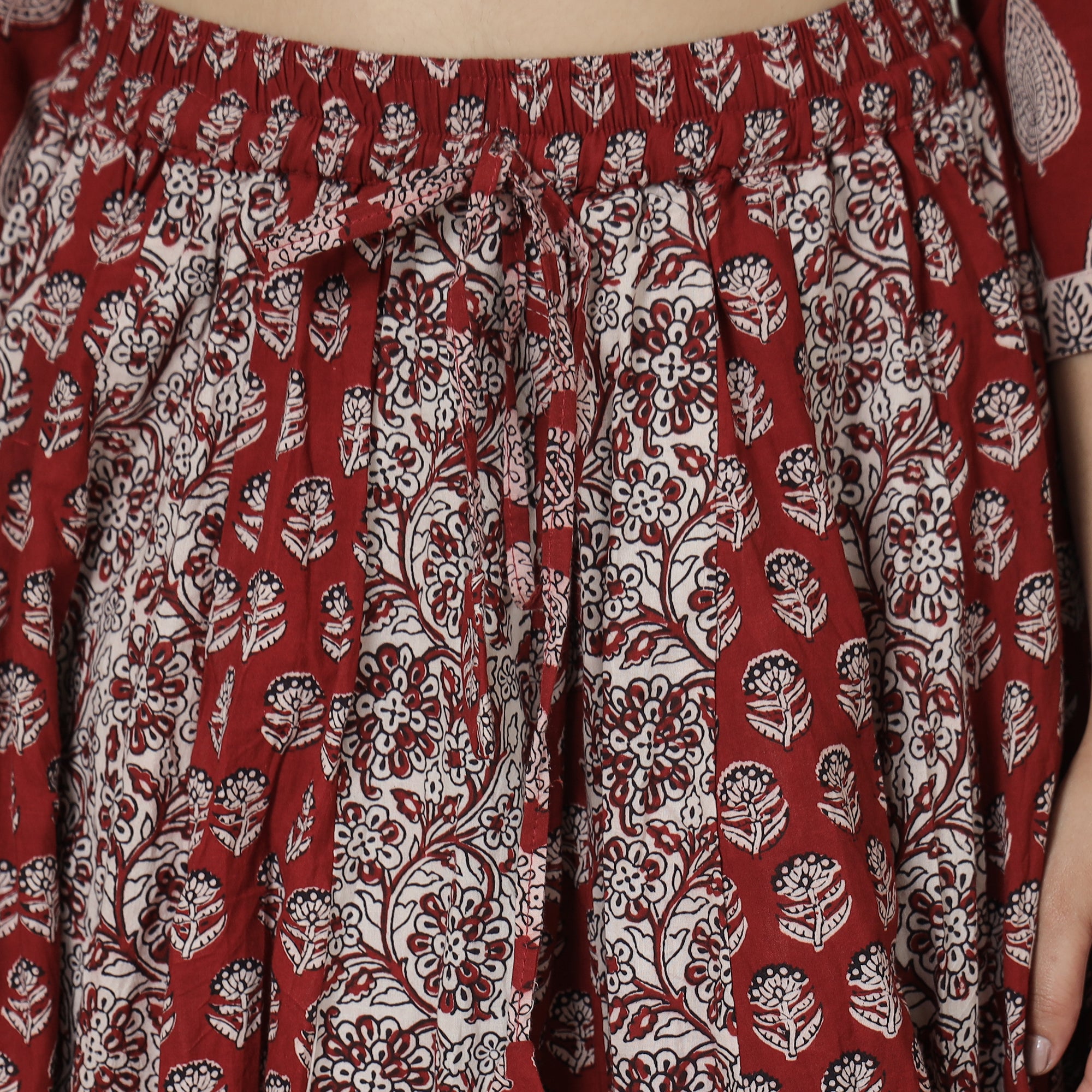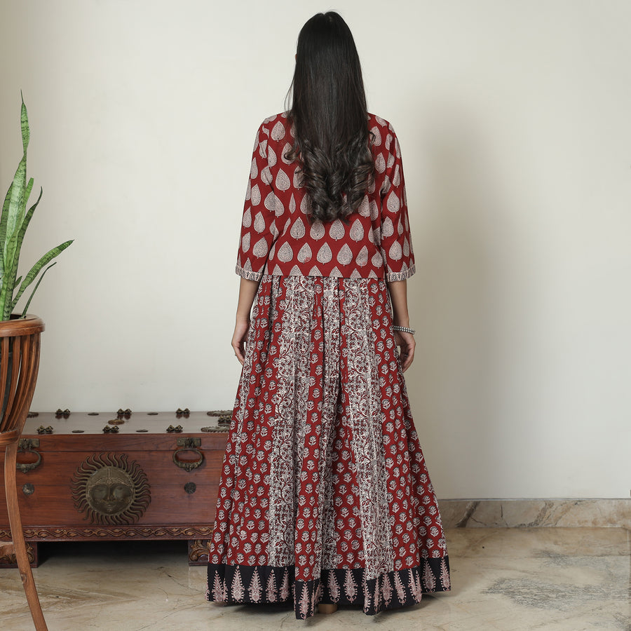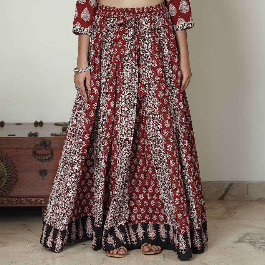This exquisite patchwork cotton long skirt is crafted from bagh block-printed, natural-dyed cotton fabric. This skirt boasts a waist tie-up closure, allowing for a customized and comfortable fit. The patchwork kali design adds a unique touch, showcasing the skilled craftsmanship behind its creation. The natural dyes used in the printing process enhance the overall beauty of the garment. The intricate patterns and vibrant colours reflect the cultural heritage of Gujarat. Perfect for both casual and semi-formal occasions.