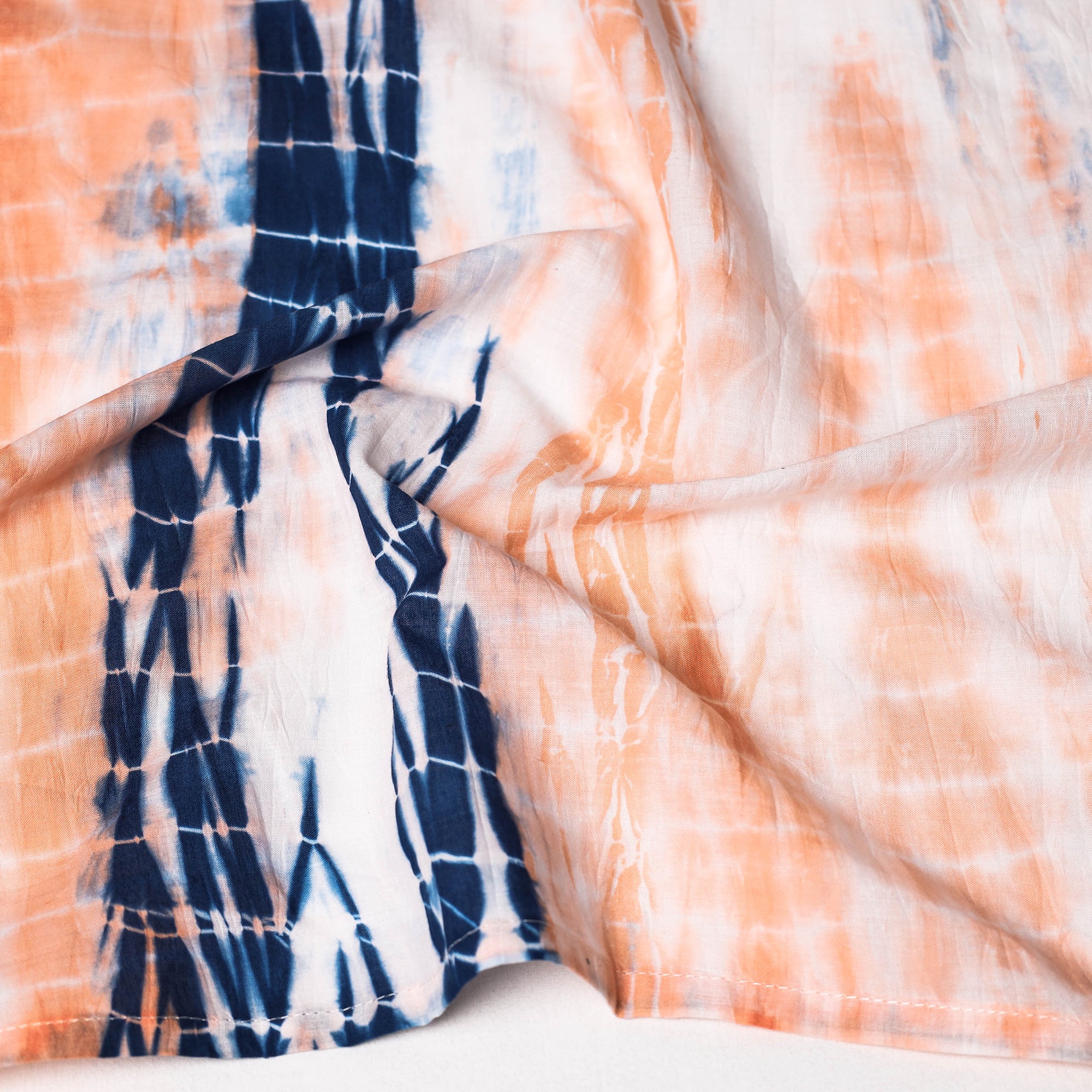 Fine quality orange shibori tie-dye cotton scarf from Rajasthan. This scarf is hand dyed using shibori tie and dye technique in which the fabric is tied using clamp or stitches in the required design and the pattern is dyed. This scarf perfect for adding a touch of elegance to your outfits, or as a head-turning accent to any ensemble. Embrace the artistry of Rajasthan and experience the comfort of pure cotton in this stunning scarf.