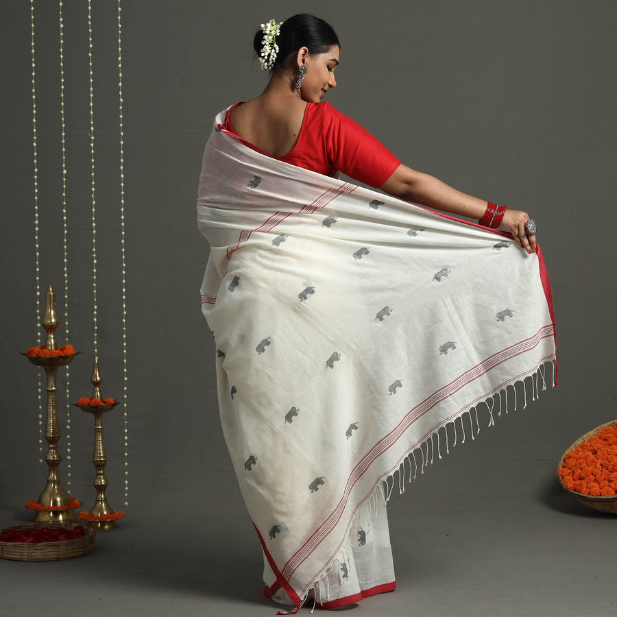 Fine quality jamdani weaving handloom cotton saree from the famous region of Phulia in West Bengal. Jamdani (extra weft) weaving, a style unique to Bengal, is literally like "hand embroidery" on the loom. The method of weaving resembles tapestry work, in which small shuttles of coloured, gold, or silver threads are passed through the warp. Jamdani, because of its intricate patterns, has always been a highly expensive product. The process is extremely time-consuming as it involves a tedious form of hand weaving.