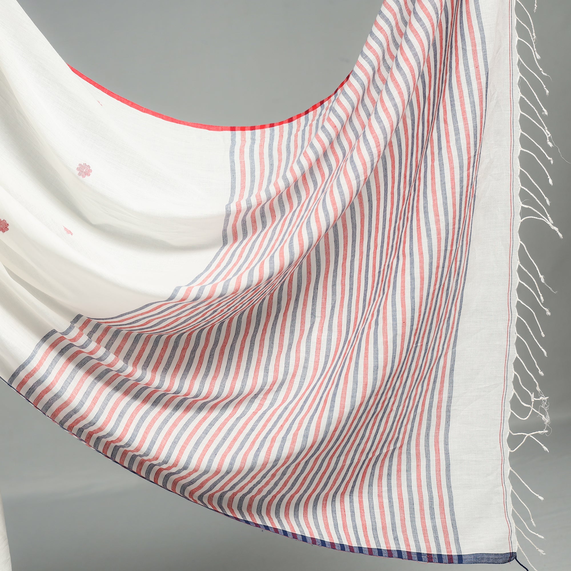 Fine quality jamdani weaving handloom cotton saree from the famous region of Phulia in West Bengal. Jamdani (extra weft) weaving, a style unique to Bengal, is literally like "hand embroidery" on the loom. The method of weaving resembles tapestry work, in which small shuttles of coloured, gold, or silver threads are passed through the warp. Jamdani, because of its intricate patterns, has always been a highly expensive product. The process is extremely time-consuming as it involves a tedious form of hand weaving.