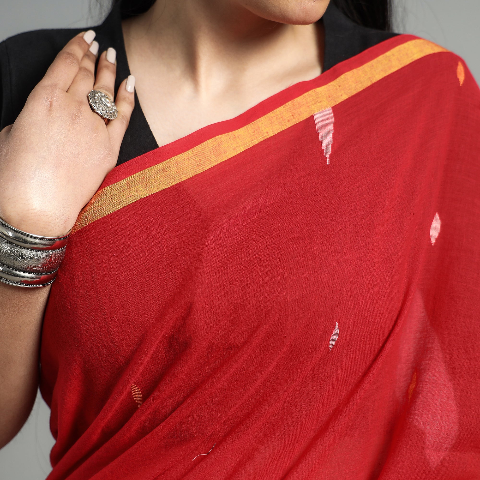 Fine quality red jamdani weaving handloom cotton saree from the famous region of Phulia in West Bengal. Jamdani (extra weft) weaving, a style unique to Bengal, is literally like "hand embroidery" on the loom. The method of weaving resembles tapestry work, in which small shuttles of coloured, gold, or silver threads are passed through the warp. Jamdani, because of its intricate patterns, has always been a highly expensive product. The process is extremely time-consuming as it involves a tedious form of hand weaving.
