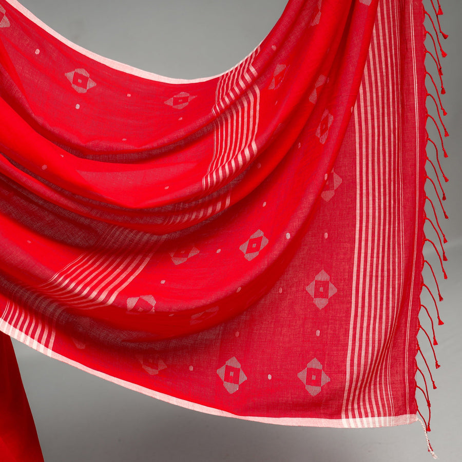 Fine quality jamdani weaving handloom cotton saree from the famous region of Phulia in West Bengal. Jamdani (extra weft) weaving, a style unique to Bengal, is literally like "hand embroidery" on the loom. The method of weaving resembles tapestry work, in which small shuttles of coloured, gold, or silver threads are passed through the warp. Jamdani, because of its intricate patterns, has always been a highly expensive product. The process is extremely time-consuming as it involves a tedious form of hand weaving.