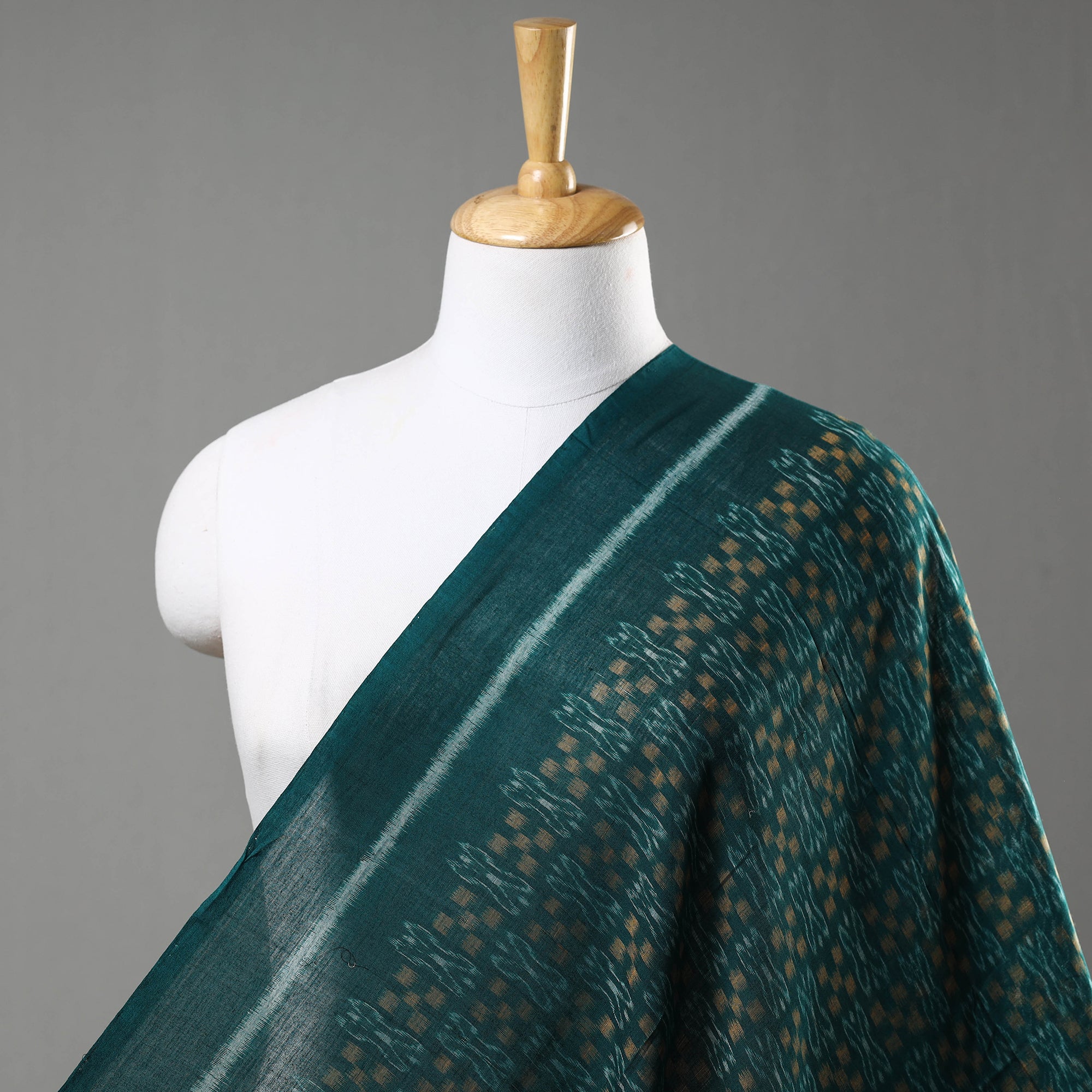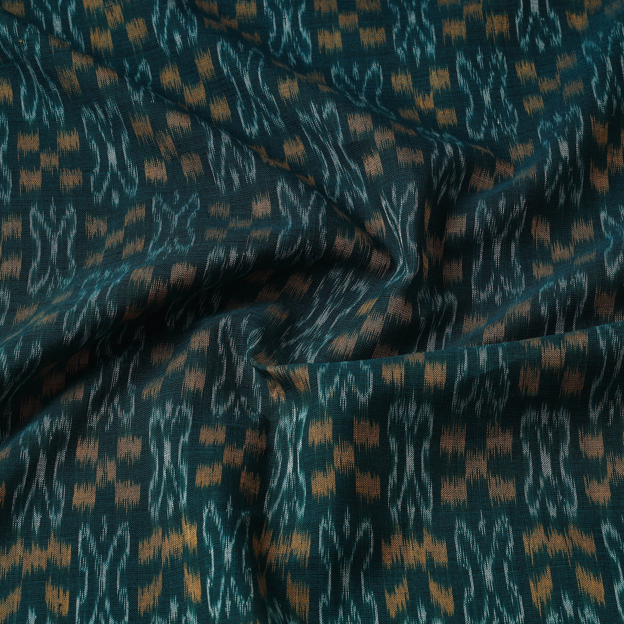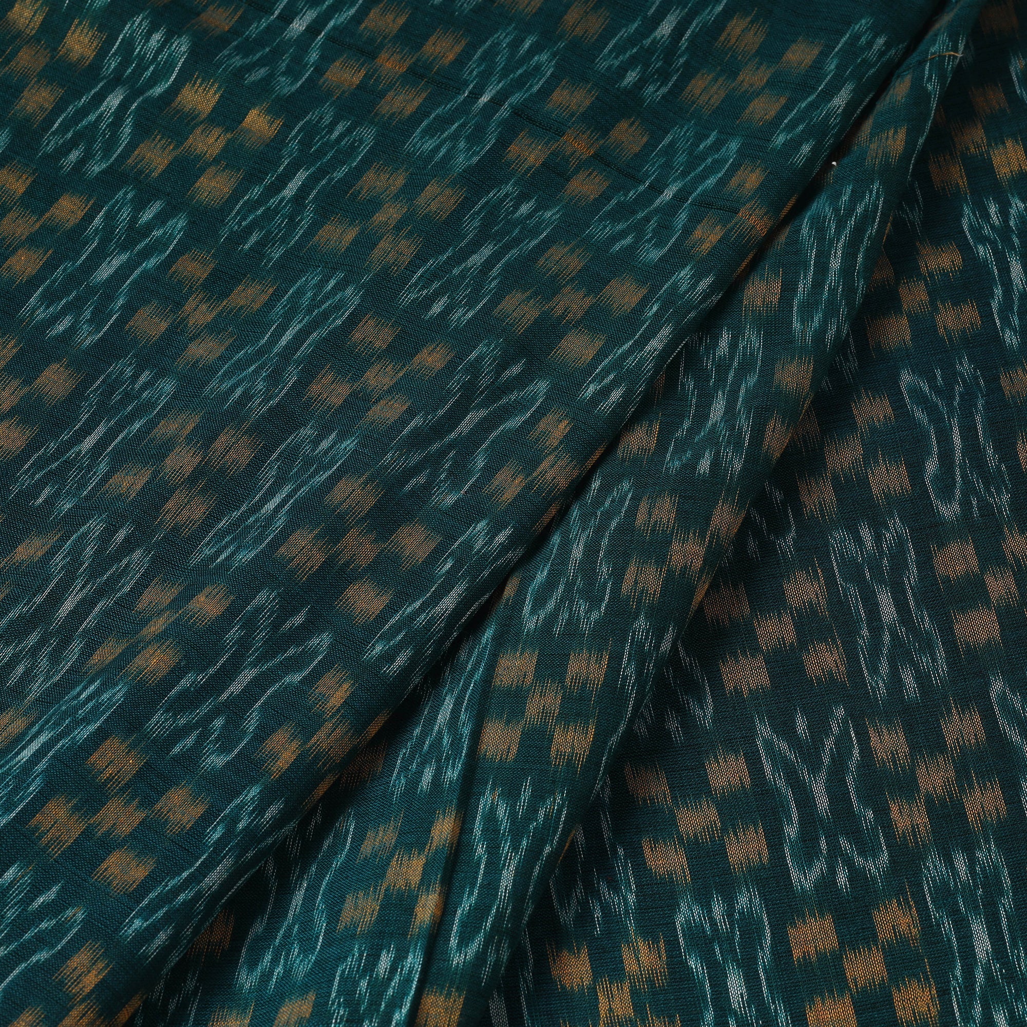 Fine quality Special Sambalpuri Ikat Handloom Cotton Fabric from Odisha with traditional motifs like shankha (shell), chakra (wheel), and phula (flower) by master artisans from the eastern states of India. Ikat (Ikkat) is a dyeing technique used to pattern textiles that employs a resist dyeing process similar to tie-dye on either the warp or weft fibres prior to dyeing. Ikat has lovely patterns and is world-famous for its extremely beautiful colours, textures, and designs. Indian Ikat is always admired by fashion designers around the world. This piece carries tiny knots, thread pulls, or uneven lines — not flaws, but fingerprints. Every irregularity is a whisper from the hands that made it. It’s what happens when tradition weaves through time, not machines. If you’re looking for perfection, this isn’t it. But if you’re looking for soul — you’ve found it.