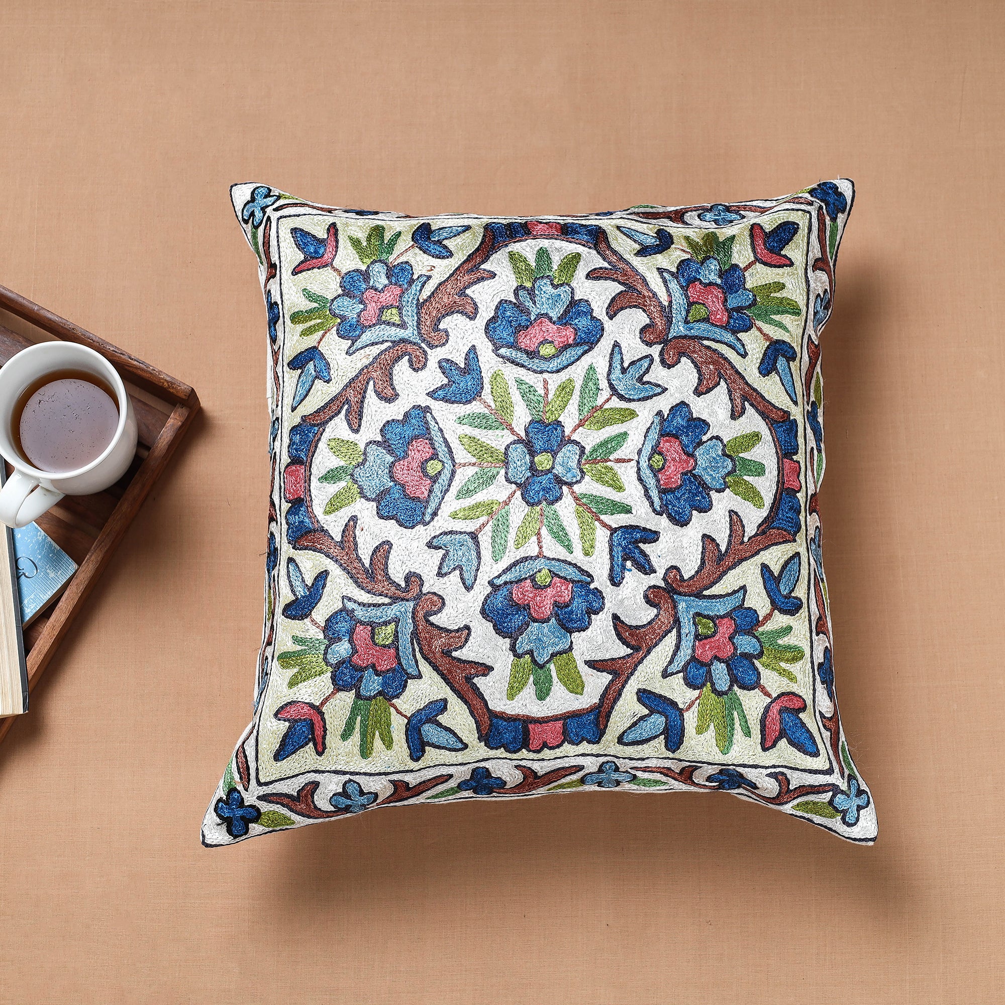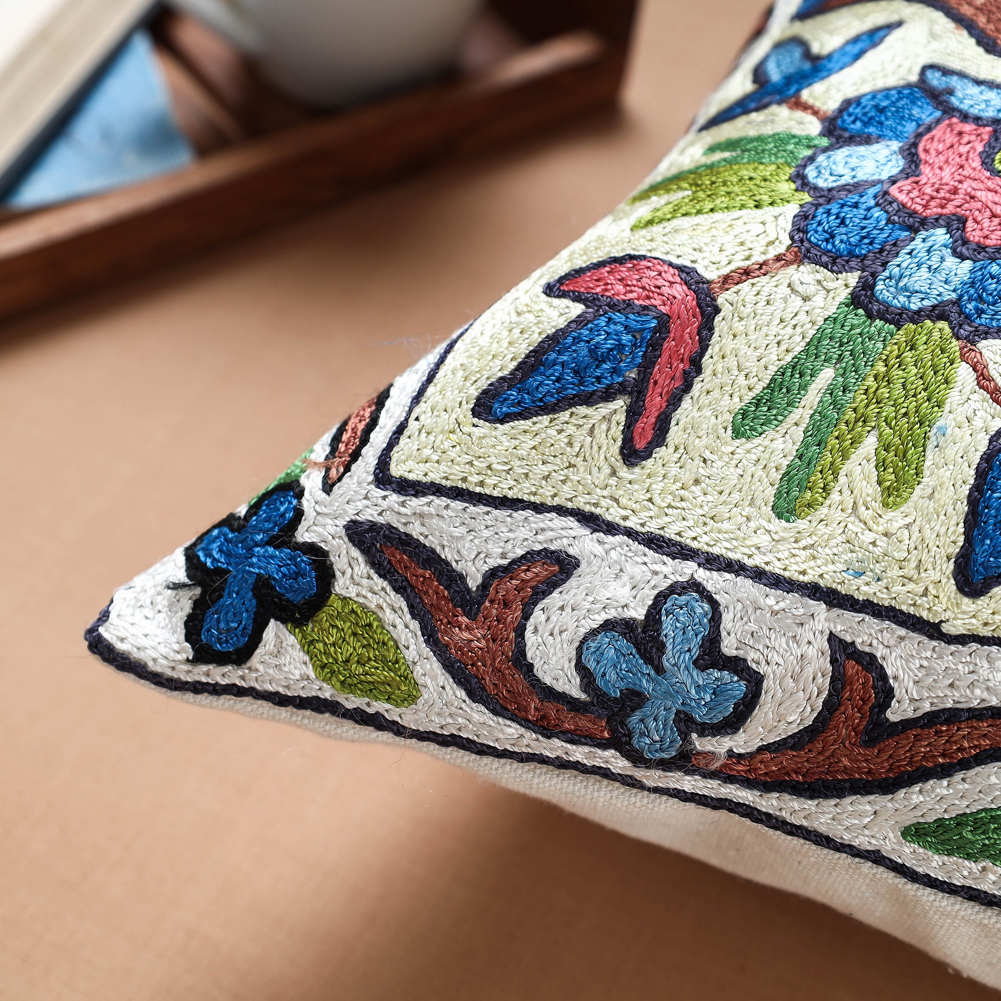 Fine quality multicolor original chain stitch crewel thread hand embroidered silk cushion cover to enhance your home decor with artisanal elegance . Crewel work is a type of surface embroidery traditionally made in Kashmir using wool or silk yarn, silk is known for its beauty and natural elegance. A wide variety of different embroidery stitches are used to follow a design outline applied to the fabric. The technique is at least a thousand years old.