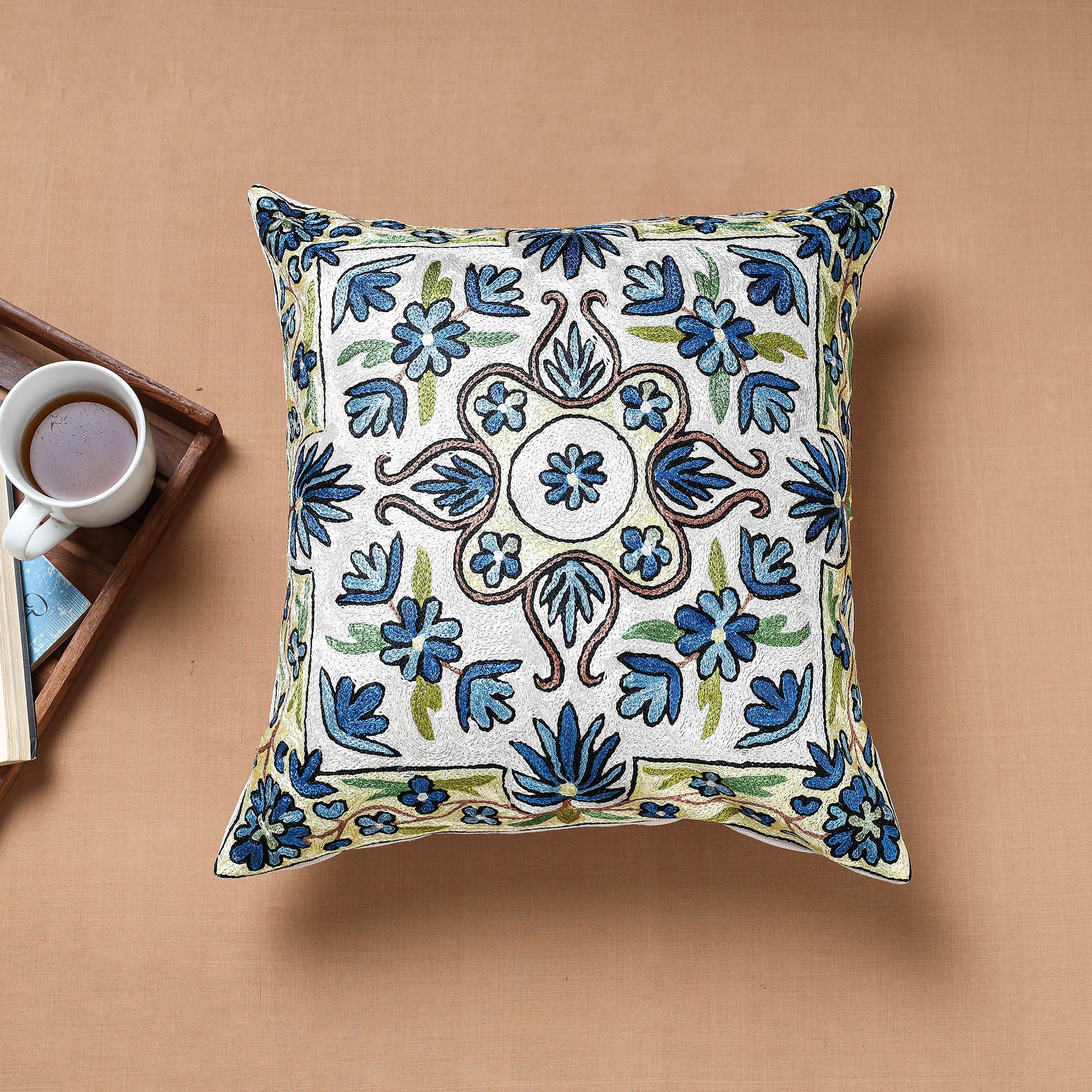 Fine quality blue original chain stitch crewel thread hand embroidered silk cushion cover to enhance your home decor with artisanal elegance. Crewel work is a type of surface embroidery traditionally made in Kashmir using wool or silk yarn, silk is known for its beauty and natural elegance. A wide variety of different embroidery stitches are used to follow a design outline applied to the fabric. The technique is at least a thousand years old.
