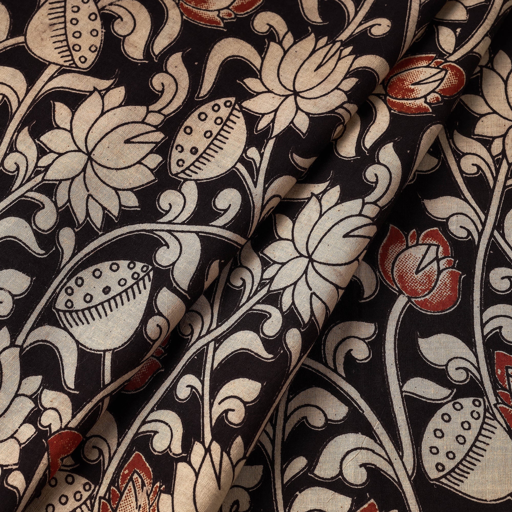 Fine quality kalamkari screen printed cotton fabric skillfully crafted by the artisans of Tamil Nadu. Kalamkari is the earliest and more complex technique printing. Showcasing an assortment of hand block and screen printed motifs inspired by traditional kalamkari painting, florals, vines, mudras, figurines, elephants and more.