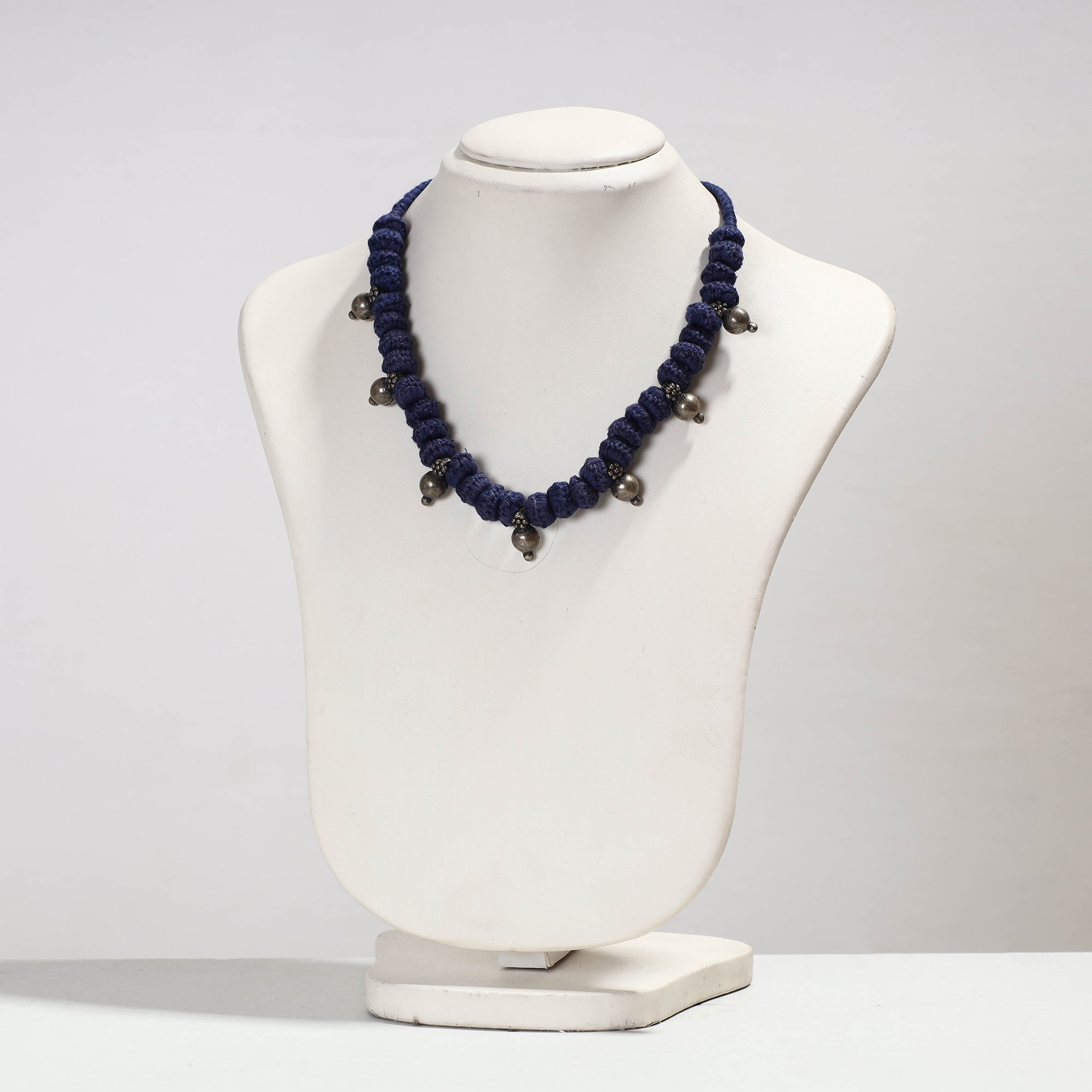 Bijapur Banjara lambani tribal blue handmade necklace. These necklace are made from metal & thread. Lambanis are a gypsy nomadic tribe based in parts of Maharashtra, Andhra Pradesh and North Karnataka who are involved in the creation of a certain kind of tribal jewellery, that comprises handmade cotton yarn beads interspersed with metal beads and metal pendants.