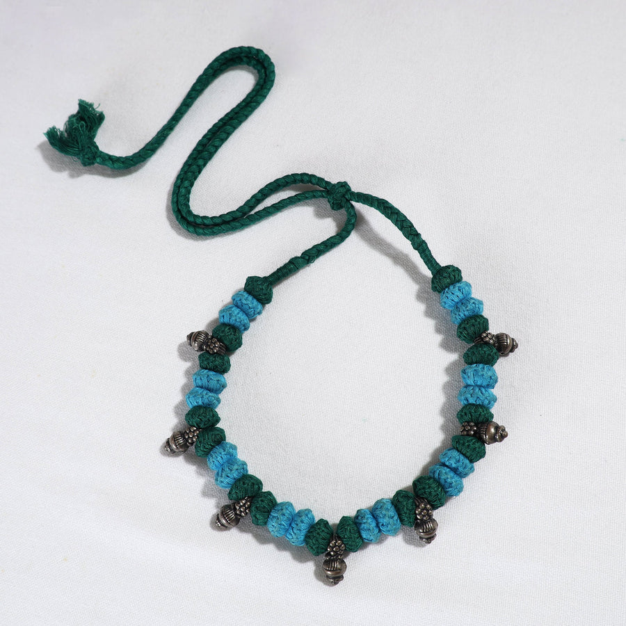 Blue Bijapur Banjara lambani tribal handmade necklace. These necklace are made from metal & thread. Lambanis are a gypsy nomadic tribe based in parts of Maharashtra, Andhra Pradesh and North Karnataka who are involved in the creation of a certain kind of tribal jewellery, that comprises handmade cotton yarn beads interspersed with metal beads and metal pendants.