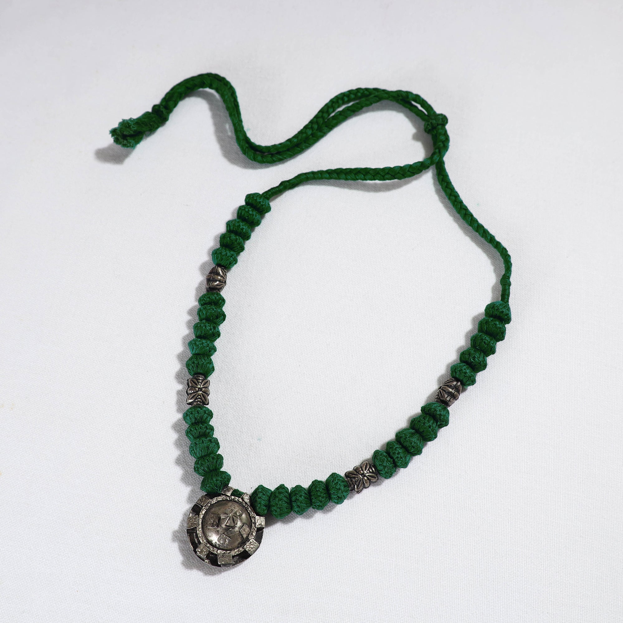Green Bijapur Banjara lambani tribal handmade necklace. These necklace are made from metal & thread. Lambanis are a gypsy nomadic tribe based in parts of Maharashtra, Andhra Pradesh and North Karnataka who are involved in the creation of a certain kind of tribal jewellery, that comprises handmade cotton yarn beads interspersed with metal beads and metal pendants.