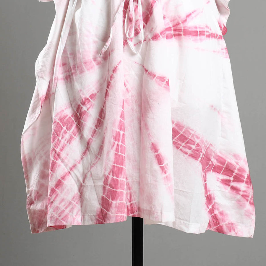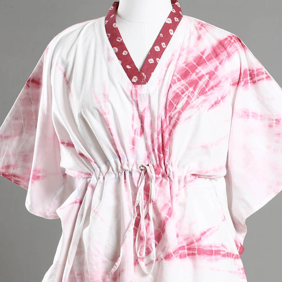 Fine quality shibori tie-dye cotton kaftan with adjustable drawstring waist tie. A traditional kaftan or caftan is an knee-length garment with long, flowing sleeves. These loose-fitting cotton kaftans are enhanced by hand dyed using shibori tie and dye technique in which the fabric is tied using clamp or stitches in the required design and the pattern is dyed. This dress will allow you to move with ease and comfort. The drawstring waist tie will give you the freedom to customize the fit to suit your unique shape. The kaftan is free-size and can be adjusted to perfection with the drawstring at the waist.