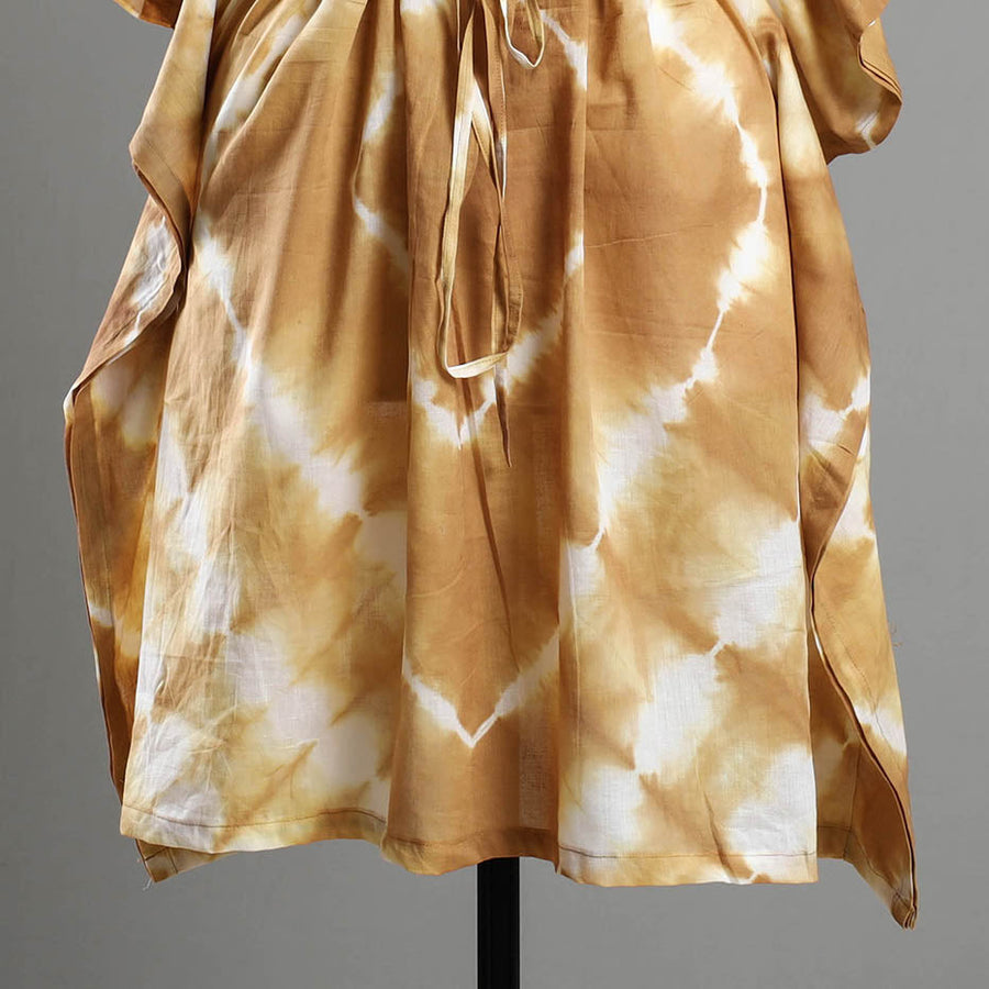 Fine quality shibori tie-dye cotton kaftan with adjustable drawstring waist tie. A traditional kaftan or caftan is an knee-length garment with long, flowing sleeves. These loose-fitting cotton kaftans are enhanced by hand dyed using shibori tie and dye technique in which the fabric is tied using clamp or stitches in the required design and the pattern is dyed. This dress will allow you to move with ease and comfort. The drawstring waist tie will give you the freedom to customize the fit to suit your unique shape. The kaftan is free-size and can be adjusted to perfection with the drawstring at the waist.