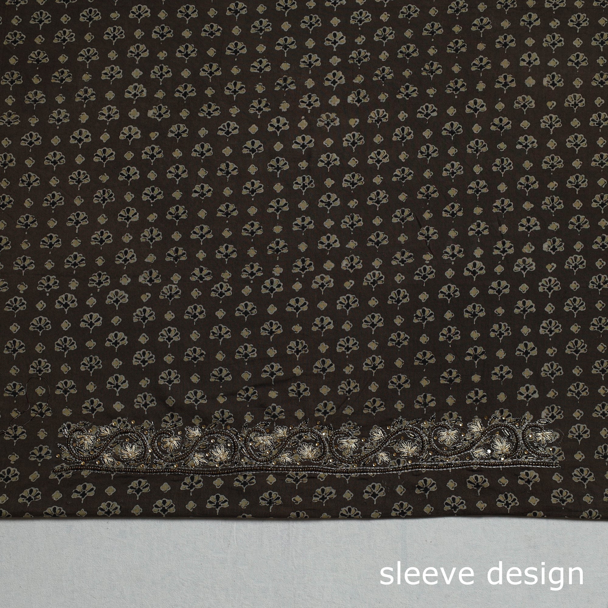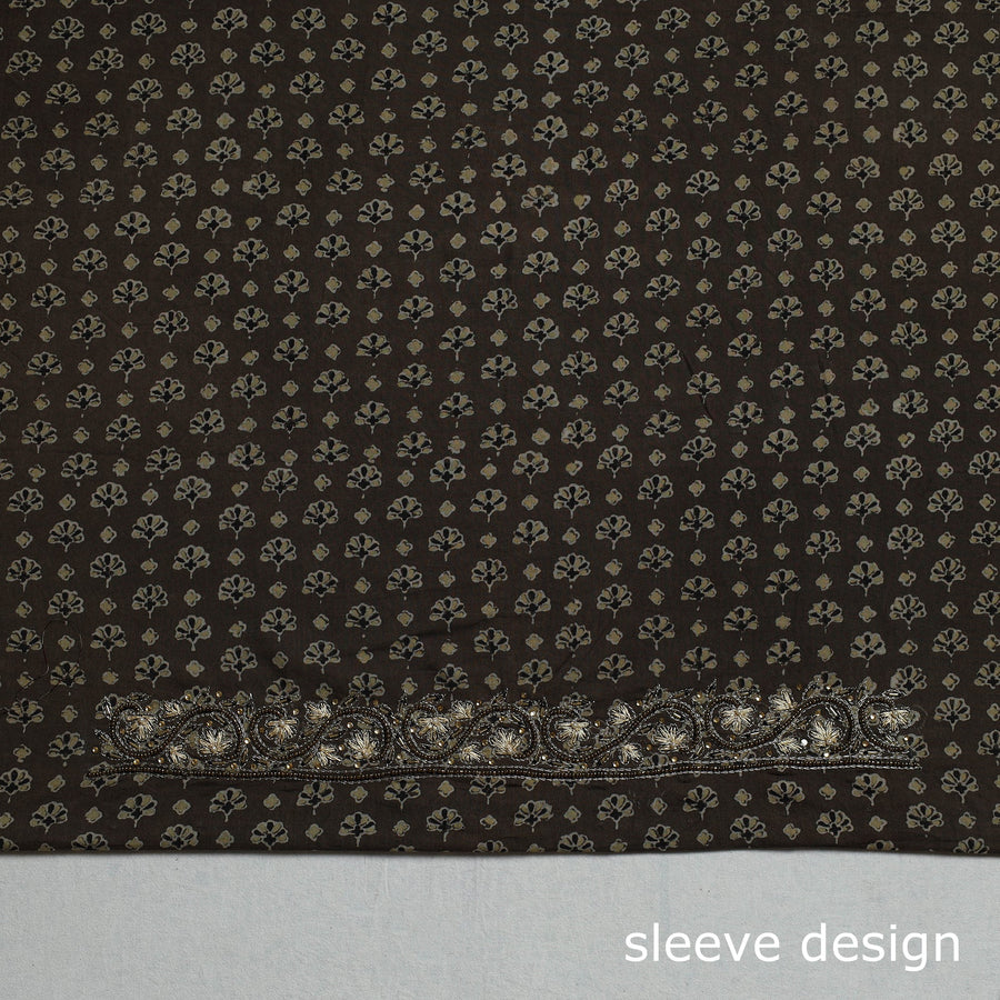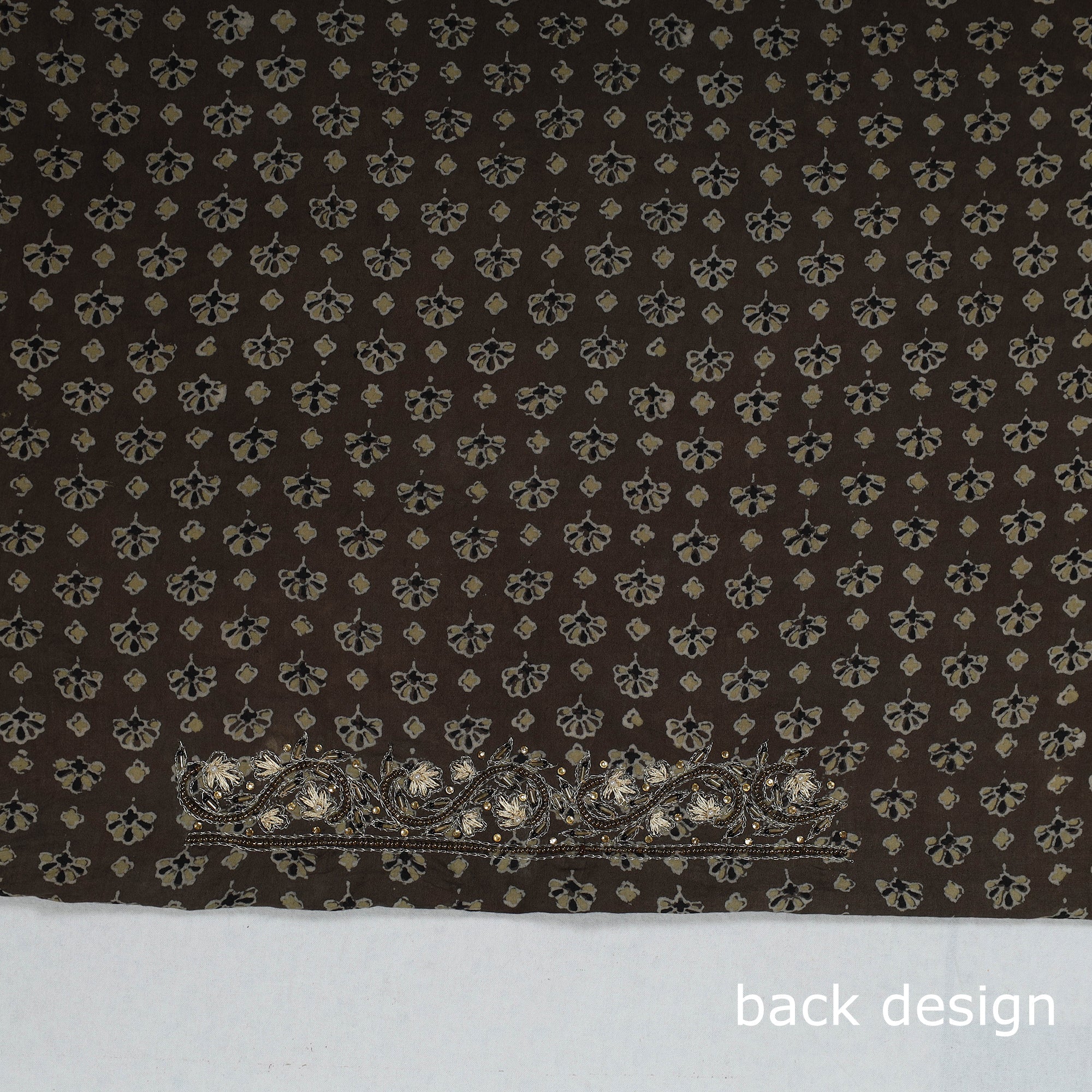 Fine quality ajrakh block printed thread and bead work hand embroidery cotton blouse material made using natural dyes through the traditional process of hand block printing practiced by the master artisans. Thread and beadwork embellishments are added with meticulous hand embroidery, ensuring each piece is a work of art. Perfect for crafting stunning blouses, this blouse material allows you to embrace tradition and elegance.