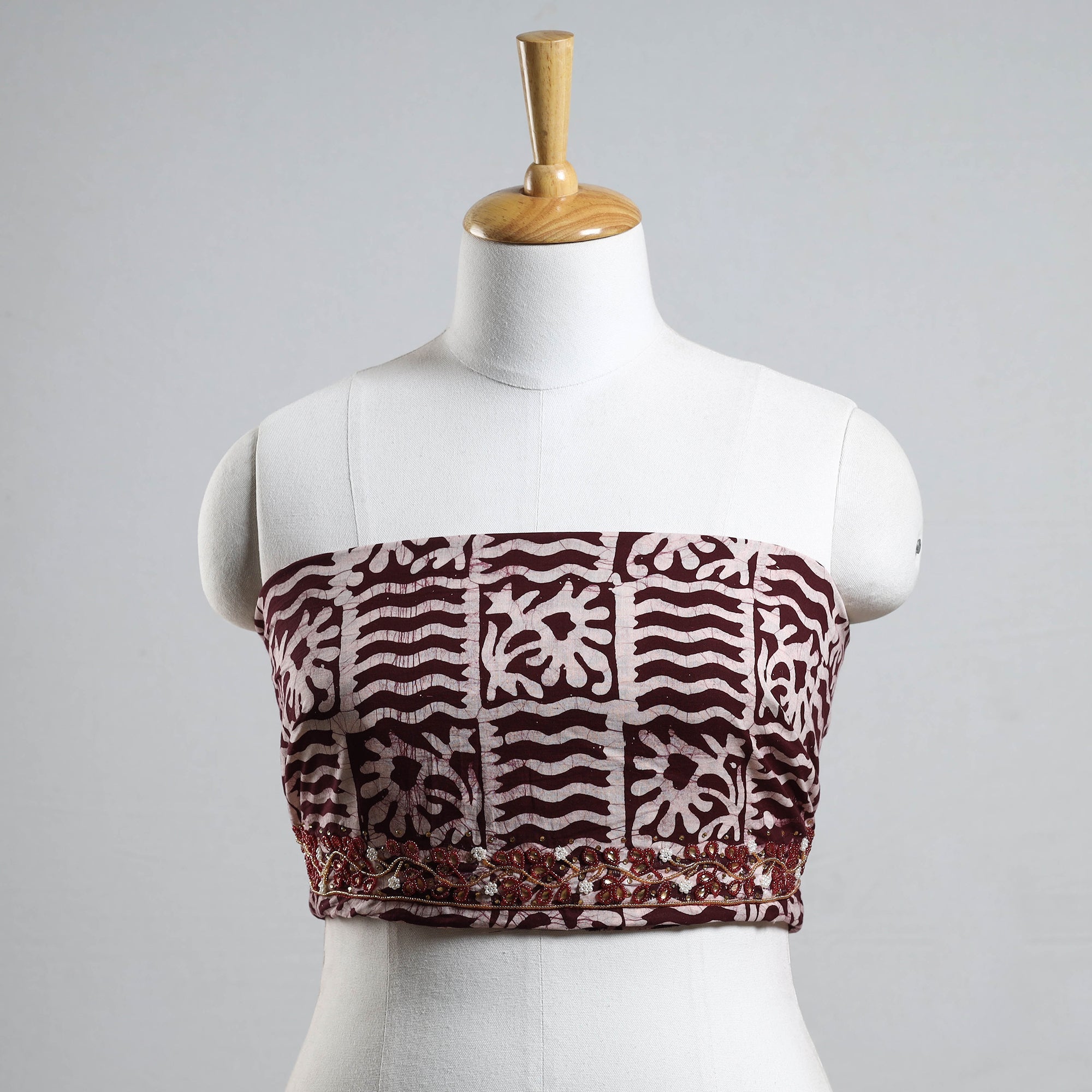 Fine quality maroon batik printed bead work hand embroidery cotton blouse material, expertly crafted from of high-quality cotton material and adorned with traditional handmade textiles of India. This versatile mix and match blouse material is perfect to pair with any saree, adding a touch of elegance to your ensemble. Made with the finest quality materials, this blouse material ensures comfort and style, making it a must-have addition to your wardrobe.