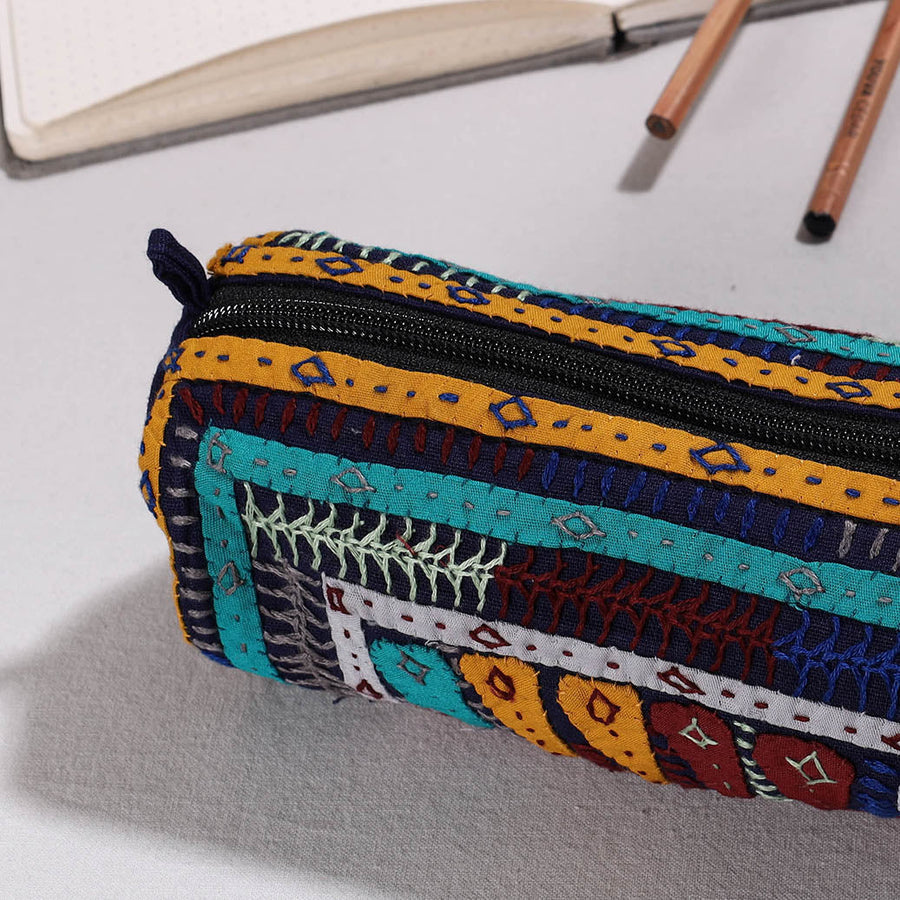 This exquisite multipurpose pencil pouch showcases the intricate and colorful Applique Dhebariya embroidery and handcrafted by skilled craftswomen from the Kutch region of Gujarat. Made with cotton fabric, the pencil pouch features a beautiful combination of applique work and hand embroidery that adds a touch of elegance and uniqueness to its design. Its vibrant colors and intricate designs make it a versatile accessory, perfect for storing pens, pencils, makeup, or small essentials, adding a touch of artistry to your daily life.