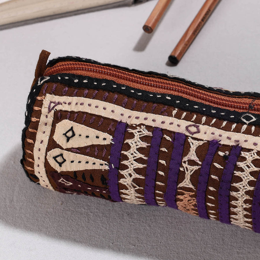 This exquisite multipurpose pencil pouch showcases the intricate and colorful Applique Dhebariya embroidery and handcrafted by skilled craftswomen from the Kutch region of Gujarat. Made with cotton fabric, the pencil pouch features a beautiful combination of applique work and hand embroidery that adds a touch of elegance and uniqueness to its design. Its vibrant colors and intricate designs make it a versatile accessory, perfect for storing pens, pencils, makeup, or small essentials, adding a touch of artistry to your daily life.