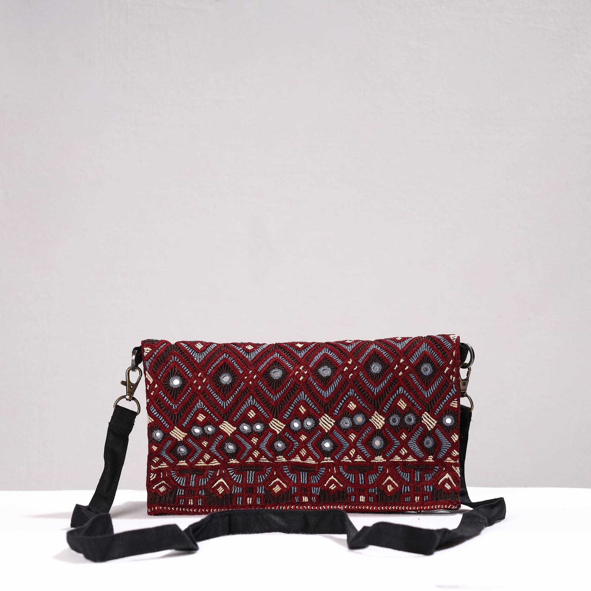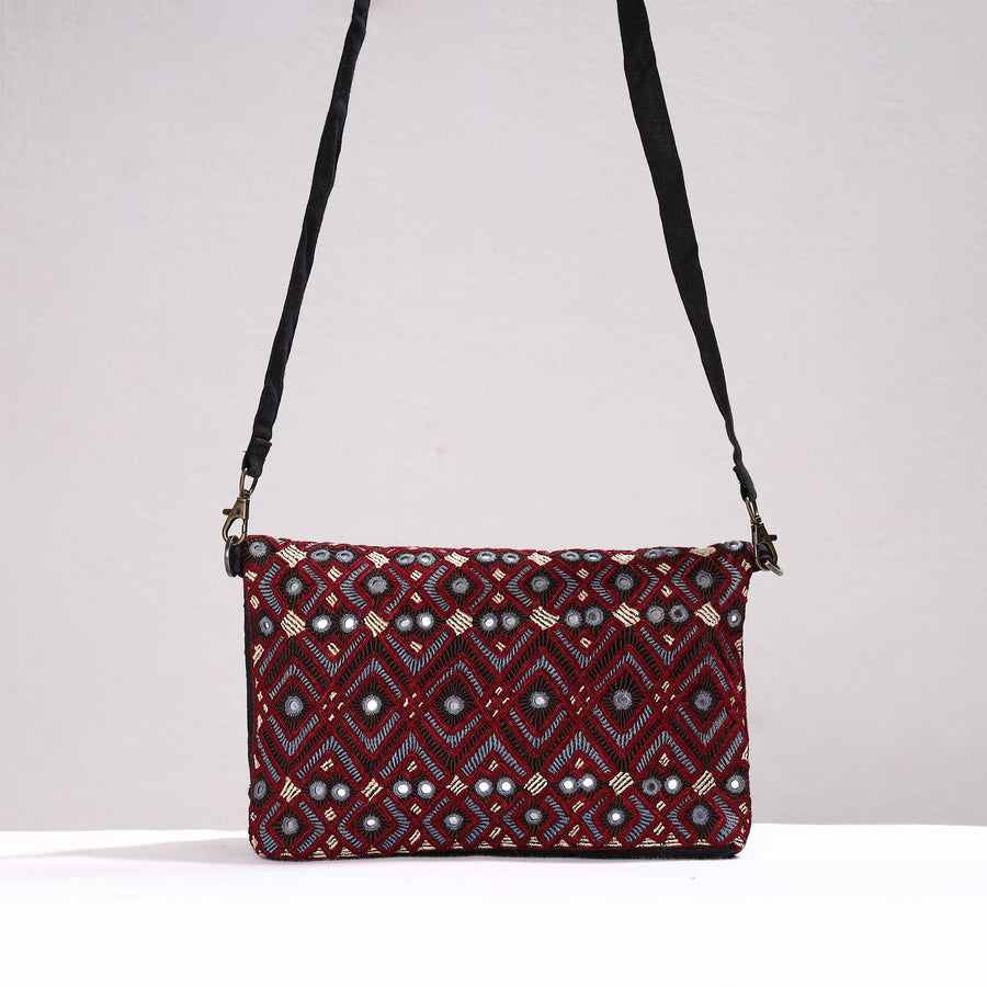 This exquisite maroon folded sling bag is a stunning piece of art, showcasing the traditional Jat embroidery craftsmanship from the Kutch region of Gujarat. The bag is made with linen fabric, featuring hand-embroidered mirror work that adds a touch of elegance and uniqueness to its design. It comes with two zipper pockets inside, providing ample space to hold your essentials. This bag is not only functional but also a reflection of the rich cultural heritage and craftsmanship of the Kutch region, making it a perfect accessory for those who appreciate traditional art and style. It has cotton fabric lining inside. This bag comes with a detachable sling.