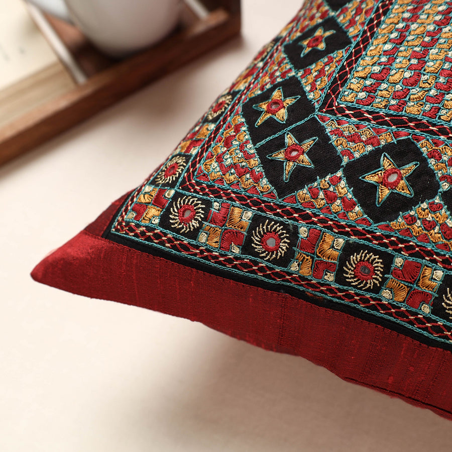 Red Kutch neran hand embroidery is done on this beautiful cushion cover. Made of silk fabric with hand-embroidered mirror work done by craftswoman in the Kutch region of Gujarat. It has a cotton fabric lining inside. Elevate your home decor with this exquisite piece, adding sophistication and culture to your living space while celebrating the rich heritage of Kutch. Artisanal Community : Sodha Rajput. Traditionally cattle herders and agriculturists, they are the most recent migrants to Kutch. In this community, women wear an embroidered Choliand jacket after their marriage. Their embroidery style is mainly referred to as Pakko (which is predominantly used) and also comprises other stitches such as Neran, Kharek, Kambhiri. Their patterns are similar to that of Meghwar. Other than the embroidery, they do patch-work and applique. The Rajputs, who are historically the protector-warriors, as a community are conservative. The women of these clans are not allowed to go outside their faliya (colony). Embroidery is the only livelihood option for women of this densely populated community and hence comprises a fairly large share of Qasab’s creations.