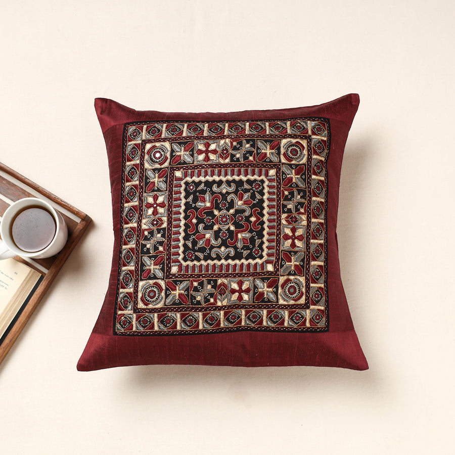 Maroon Kutch pakko hand embroidery is done on this beautiful cushion cover. Made of silk fabric with hand-embroidered mirror work done by craftswoman in the Kutch region of Gujarat. It has a cotton fabric lining inside. Elevate your home decor with this exquisite piece, adding sophistication and culture to your living space while celebrating the rich heritage of Kutch. Artisanal Community : Sodha Rajput Traditionally cattle herders and agriculturists, they are the most recent migrants to Kutch. In this community, women wear an embroidered Choliand jacket after their marriage. Their embroidery style is mainly referred to as Pakko (which is predominantly used) and also comprises other stitches such as Neran, Kharek, Kambhiri. Their patterns are similar to that of Meghwar. Other than the embroidery, they do patch-work and applique. The Rajputs, who are historically the protector-warriors, as a community are conservative. The women of these clans are not allowed to go outside their faliya (colony). Embroidery is the only livelihood option for women of this densely populated community and hence comprises a fairly large share of Qasab’s creations.