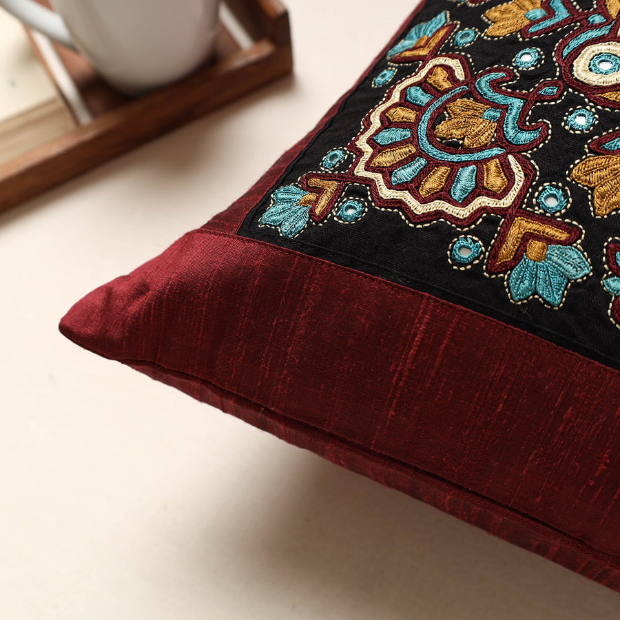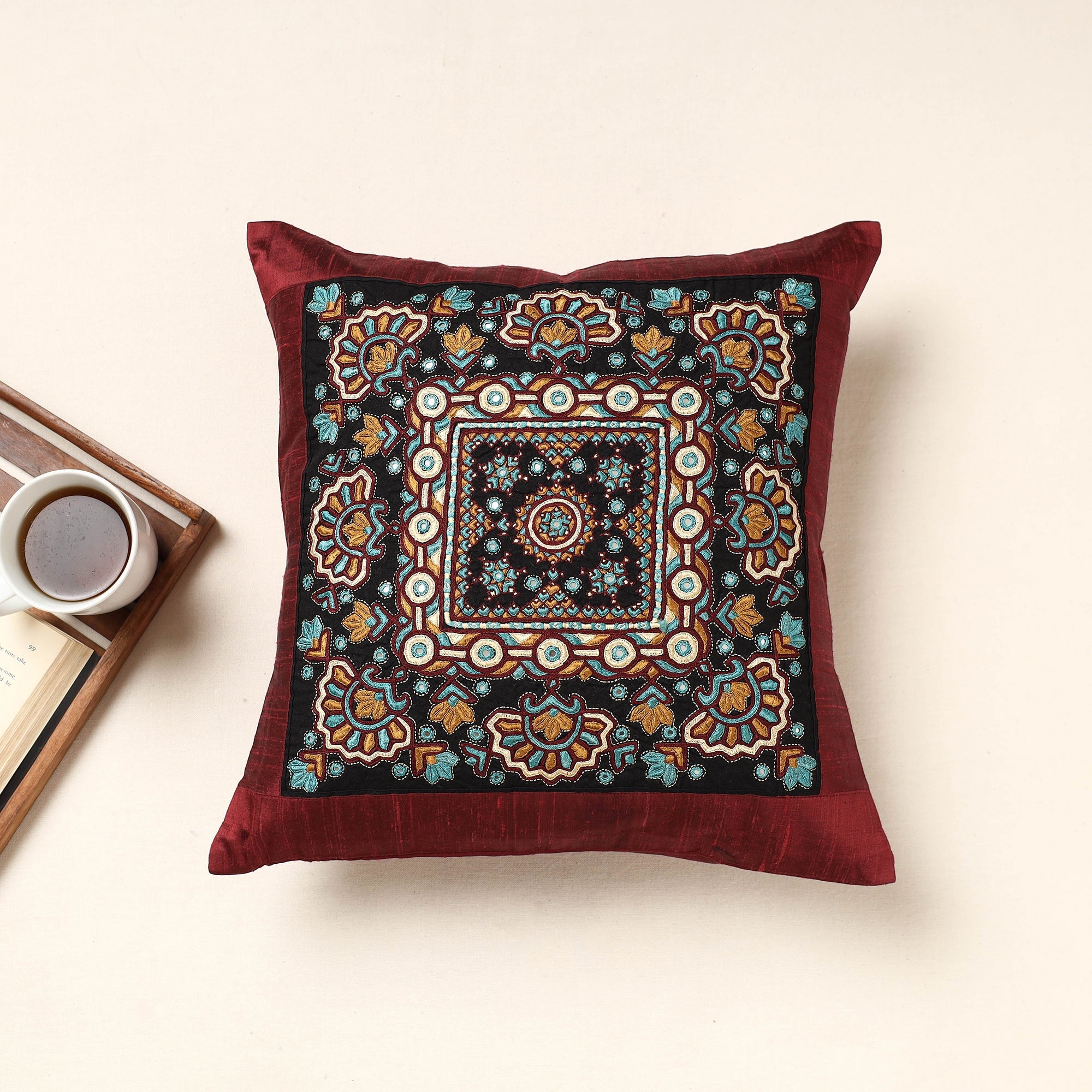 Maroon Kutch pakko hand embroidery is done on this beautiful cushion cover. Made of silk fabric with hand-embroidered mirror work done by craftswoman in the Kutch region of Gujarat. It has a cotton fabric lining inside. Elevate your home decor with this exquisite piece, adding sophistication and culture to your living space while celebrating the rich heritage of Kutch. Artisanal Community : Sodha Rajput Traditionally cattle herders and agriculturists, they are the most recent migrants to Kutch. In this community, women wear an embroidered Choliand jacket after their marriage. Their embroidery style is mainly referred to as Pakko (which is predominantly used) and also comprises other stitches such as Neran, Kharek, Kambhiri. Their patterns are similar to that of Meghwar. Other than the embroidery, they do patch-work and applique. The Rajputs, who are historically the protector-warriors, as a community are conservative. The women of these clans are not allowed to go outside their faliya (colony). Embroidery is the only livelihood option for women of this densely populated community and hence comprises a fairly large share of Qasab’s creations.