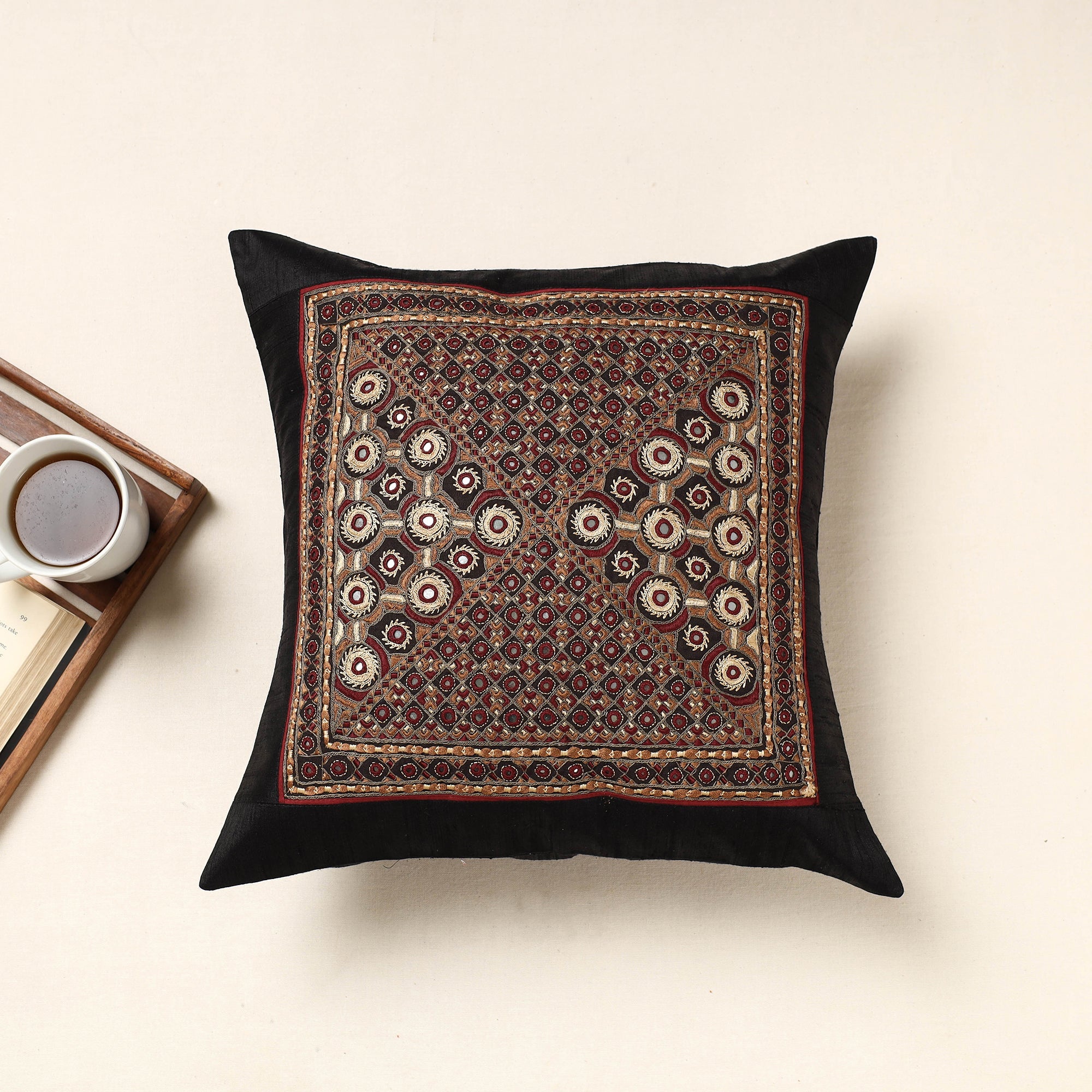 Black Kutch pakko hand embroidery is done on this beautiful cushion cover. Made of silk fabric with hand-embroidered mirror work done by craftswoman in the Kutch region of Gujarat. It has a cotton fabric lining inside. Elevate your home decor with this exquisite piece, adding sophistication and culture to your living space while celebrating the rich heritage of Kutch. Artisanal Community : Sodha Rajput Traditionally cattle herders and agriculturists, they are the most recent migrants to Kutch. In this community, women wear an embroidered Choliand jacket after their marriage. Their embroidery style is mainly referred to as Pakko (which is predominantly used) and also comprises other stitches such as Neran, Kharek, Kambhiri. Their patterns are similar to that of Meghwar. Other than the embroidery, they do patch-work and applique. The Rajputs, who are historically the protector-warriors, as a community are conservative. The women of these clans are not allowed to go outside their faliya (colony). Embroidery is the only livelihood option for women of this densely populated community and hence comprises a fairly large share of Qasab’s creations.