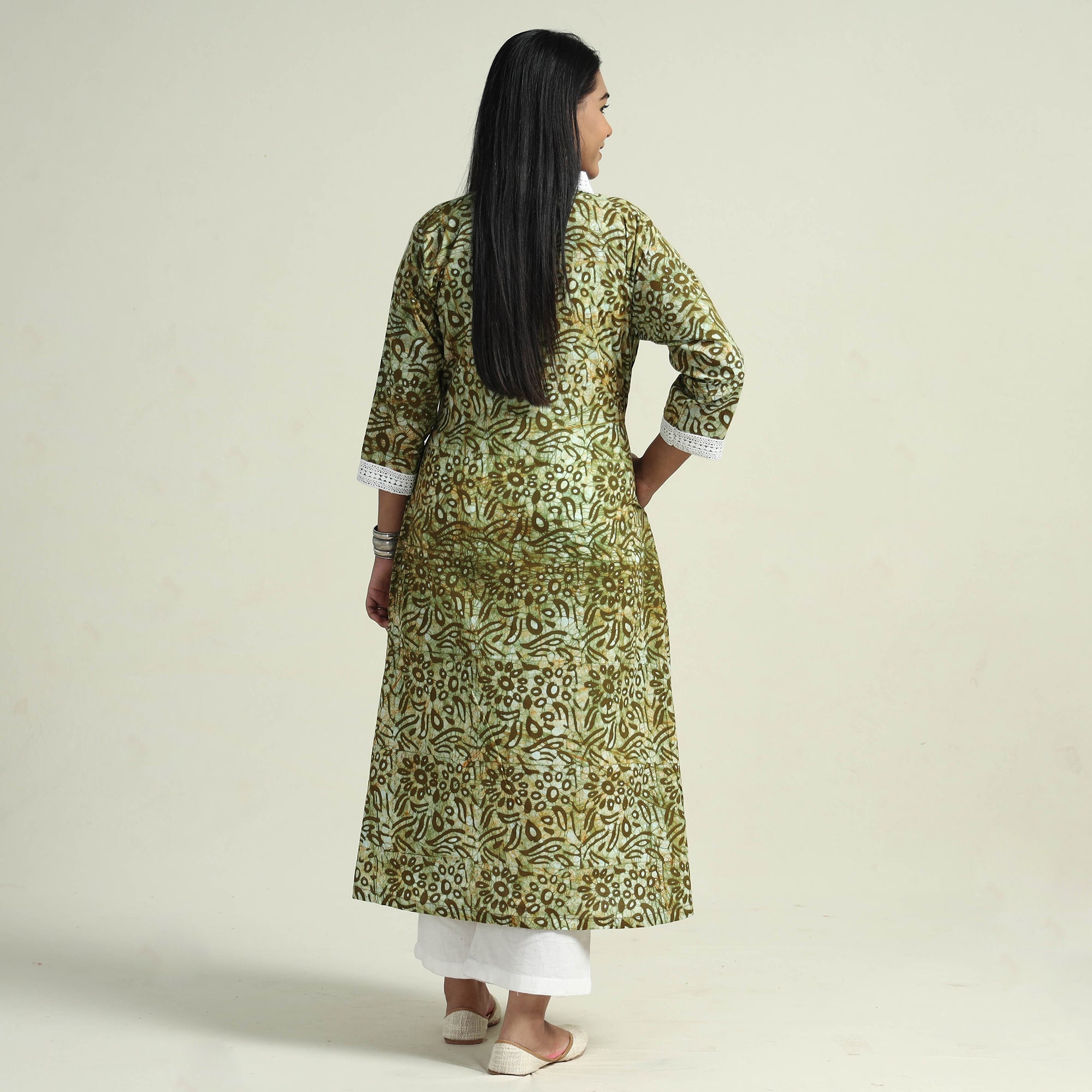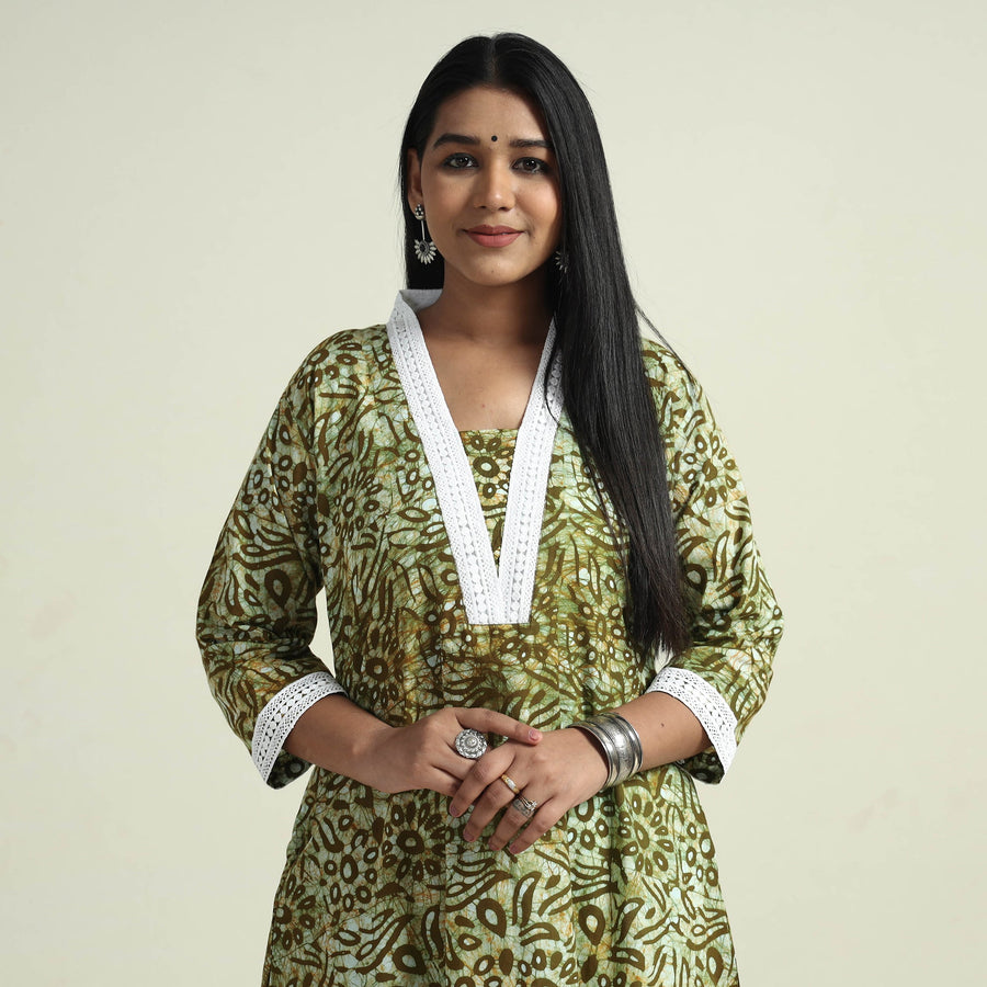 Look and feel beautiful in this uniquely designed hand batik printed cotton long Kurta with plain palazzo set. This Kurta set is crafted from cotton fabric, ensuring a comfortable feel against your skin. The Kurta also features a convenient one-side pocket, perfect for carrying small essentials, and the palazzo features an elasticized waist and two side pockets, adding functionality to this palazzo. Perfect for special occasions and celebrations, this elegant Kurta set exudes traditional charm with its hand-batik printed motifs.