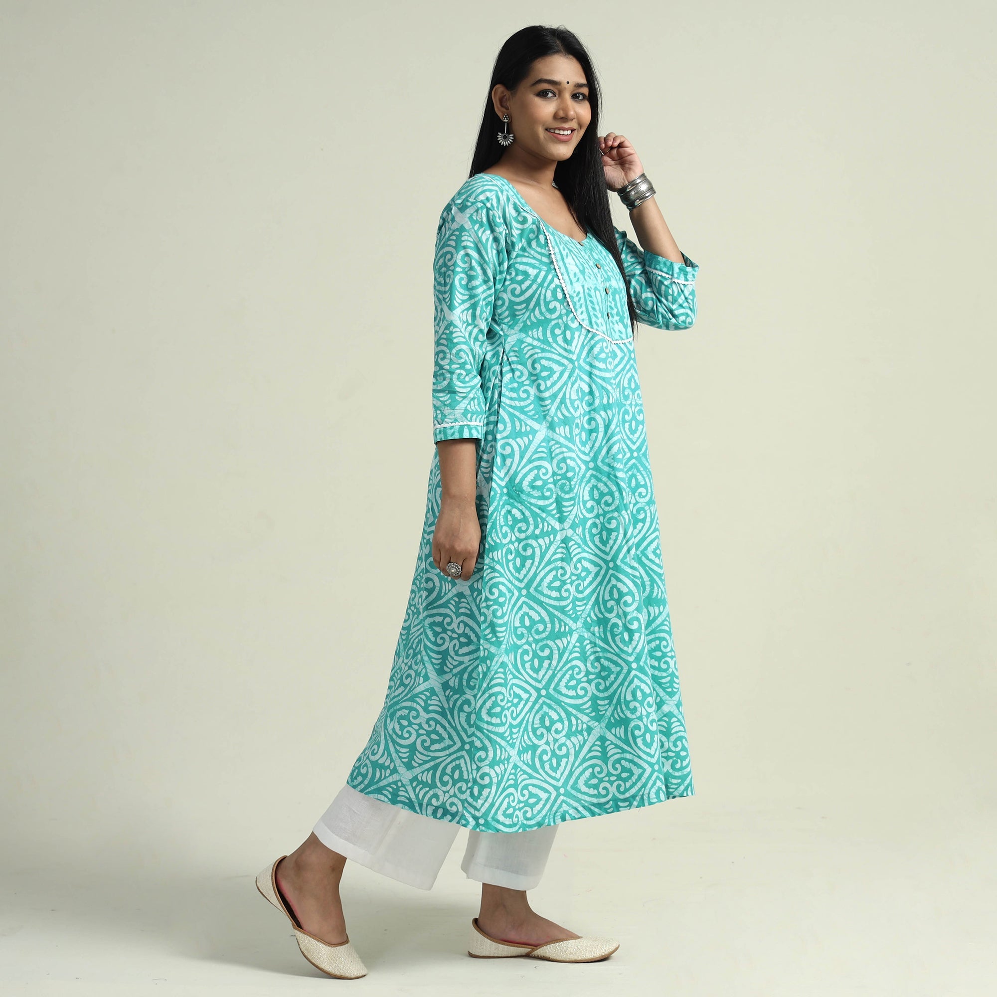 Look and feel beautiful in this uniquely designed hand batik printed cotton long Kurta with plain palazzo set. This Kurta set is crafted from cotton fabric, ensuring a comfortable feel against your skin. The Kurta also features a convenient one-side pocket, perfect for carrying small essentials, and the palazzo features an elasticized waist and two side pockets, adding functionality to this palazzo. Perfect for special occasions and celebrations, this elegant Kurta set exudes traditional charm with its hand-batik printed motifs.