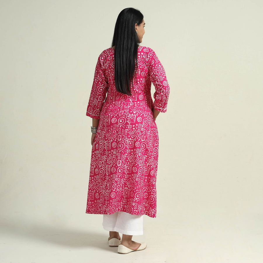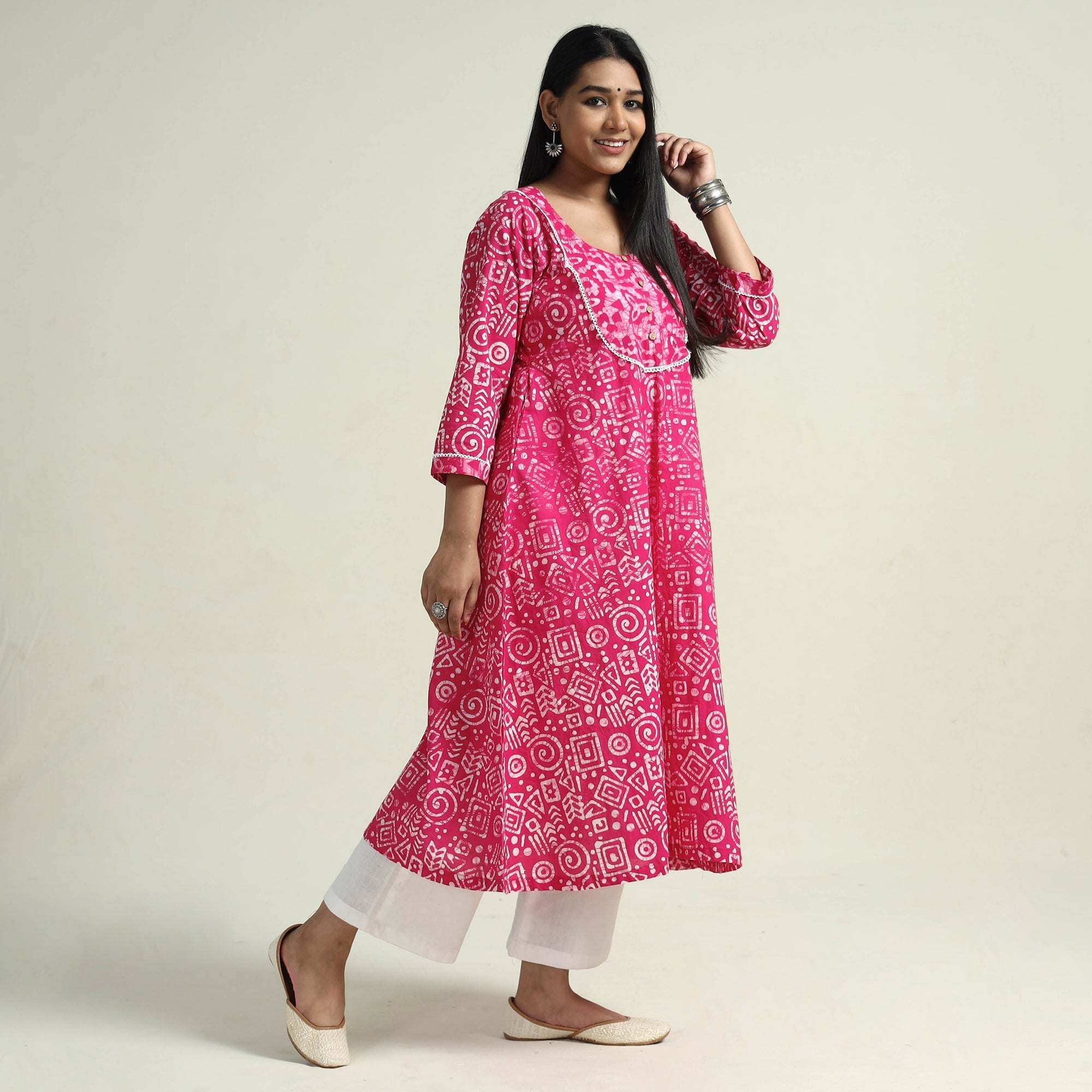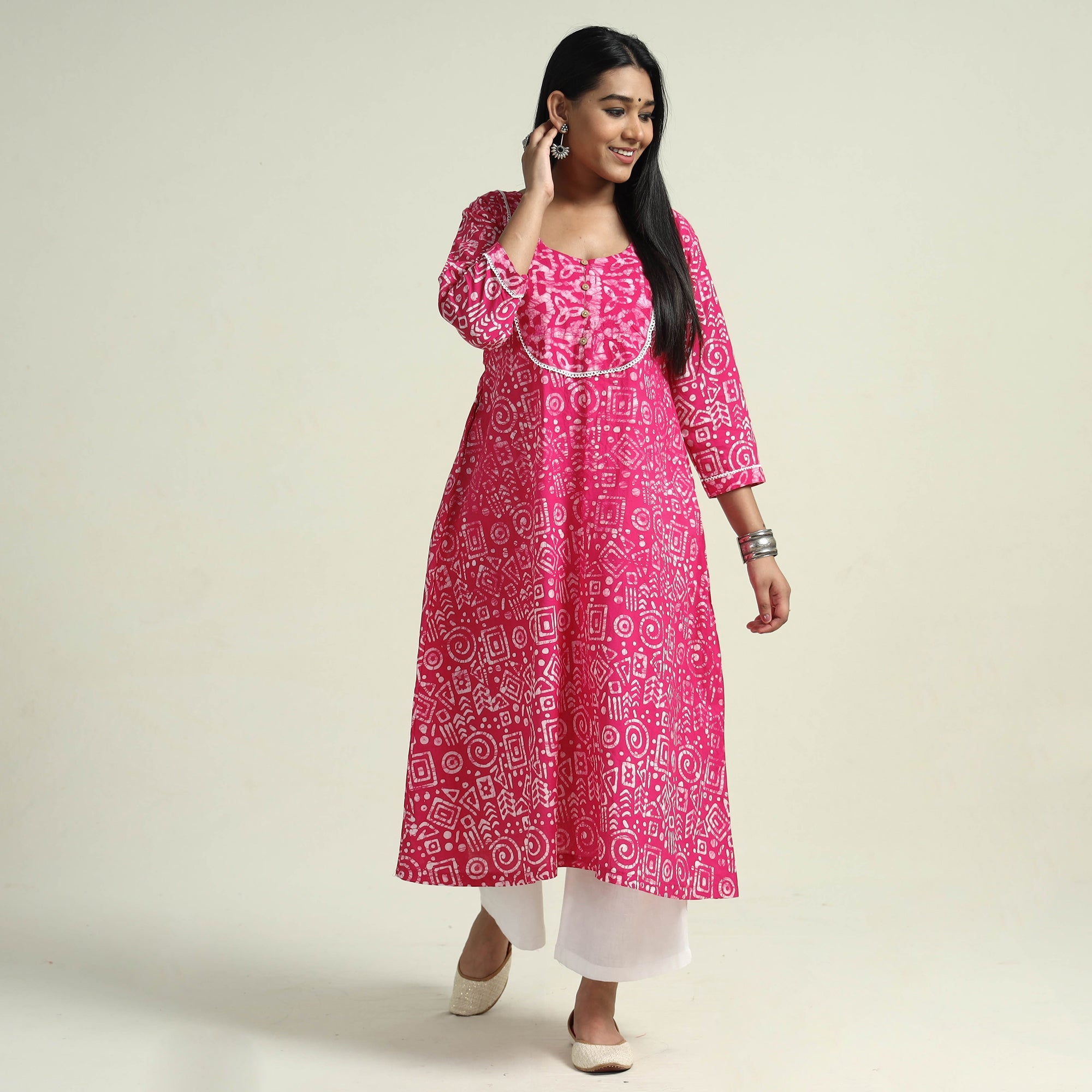 Look and feel beautiful in this uniquely designed hand batik printed cotton long Kurta with plain palazzo set. This Kurta set is crafted from cotton fabric, ensuring a comfortable feel against your skin. The Kurta also features a convenient one-side pocket, perfect for carrying small essentials, and the palazzo features an elasticized waist and two side pockets, adding functionality to this palazzo. Perfect for special occasions and celebrations, this elegant Kurta set exudes traditional charm with its hand-batik printed motifs.