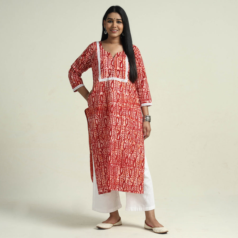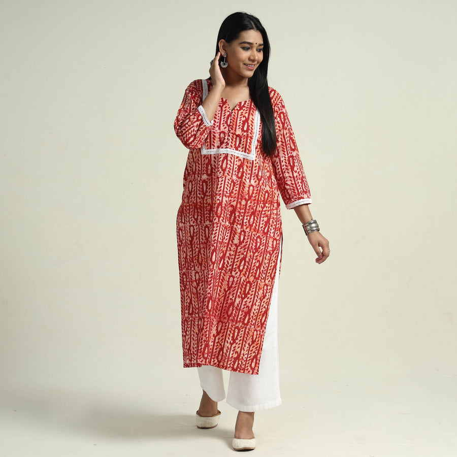 Red - Hand Embroidery Cotton A-Line Batik Print Kurta for women 02