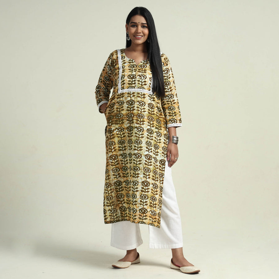 Look and feel beautiful in this uniquely designed hand batik printed cotton long Kurta with plain palazzo set. This Kurta set is crafted from cotton fabric, ensuring a comfortable feel against your skin. The Kurta also features a convenient one-side pocket, perfect for carrying small essentials, and the palazzo features an elasticized waist and two side pockets, adding functionality to this palazzo. Perfect for special occasions and celebrations, this elegant kurta set exudes traditional charm with its hand-batik printed motifs.