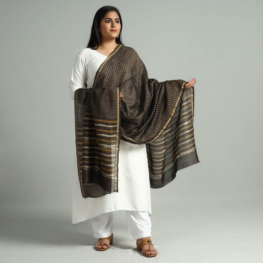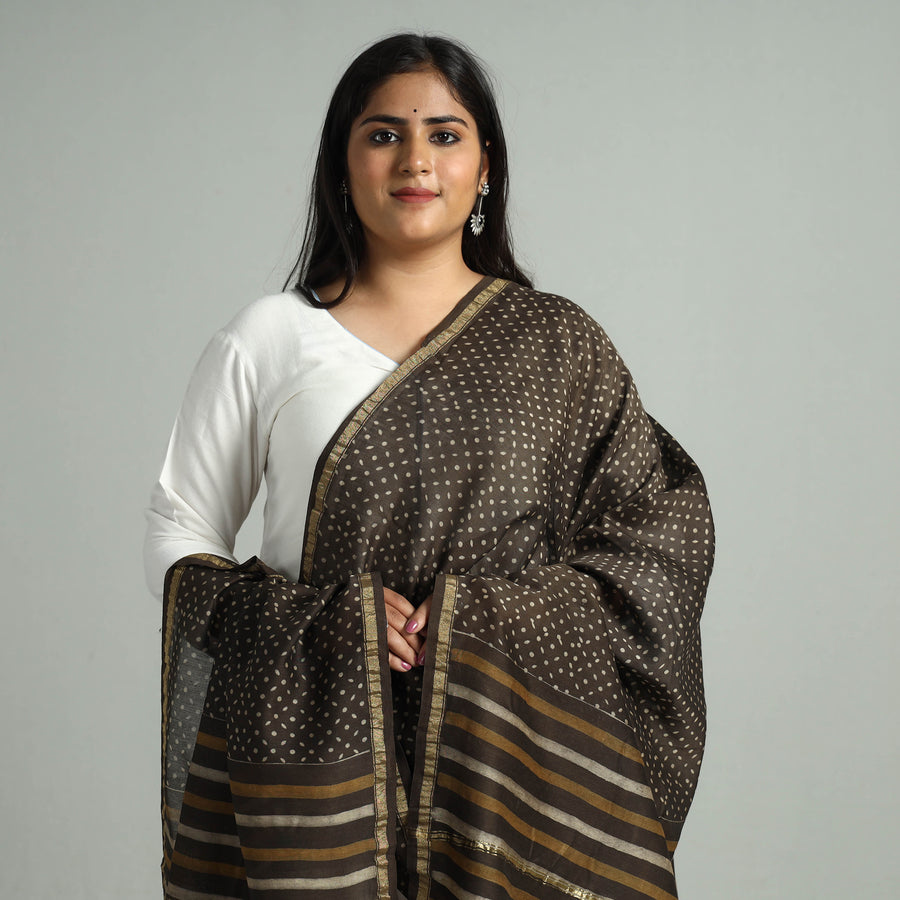 Fine quality akola dabu block printed handloom chanderi silk-cotton dupatta with zari border, made using natural dyes through traditional mud resist process of hand block printing practised by the master artisans in Akola village of Rajasthan. Chanderi silks are known for its gossamer looks and amazing feel.