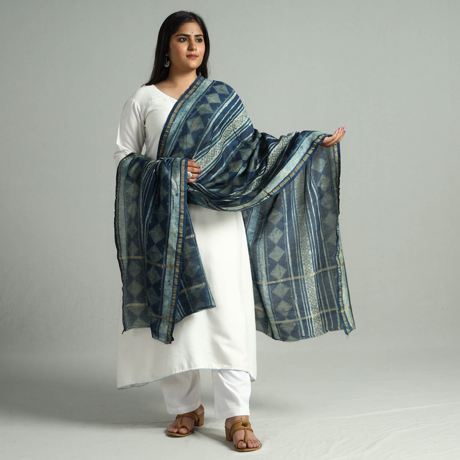 Fine quality akola dabu block printed handloom chanderi silk-cotton dupatta with zari border, made using natural dyes through traditional mud resist process of hand block printing practised by the master artisans in Akola village of Rajasthan. Chanderi silks are known for its gossamer looks and amazing feel.