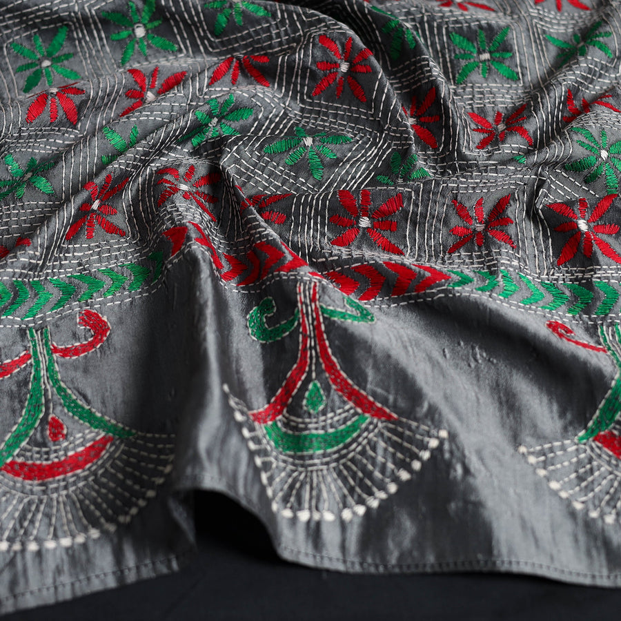 Elevate your style with an exquisite grey tussar silk handloom stole adorned with original kantha hand embroidery done by master artisan Afroza Khatun from Nanoor, West Bengal. Each stitch beautifully narrates the region's rich cultural heritage, making it a versatile accessory for enhancing your outfits and celebrating Indian craftsmanship. Tussar silk is known for its unique texture, sheen of silk and feel of cotton. A perfect blend of both worlds completely suitable for all weathers. This stole is perfect for both casual and formal wear, it's a versatile addition to your wardrobe.