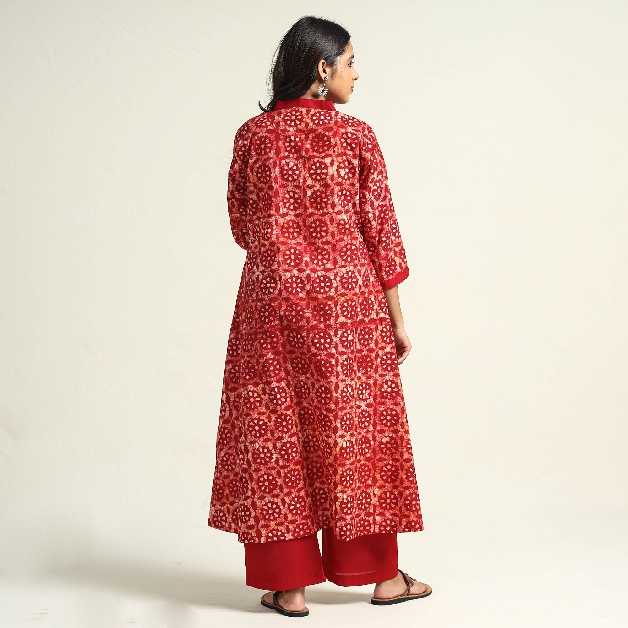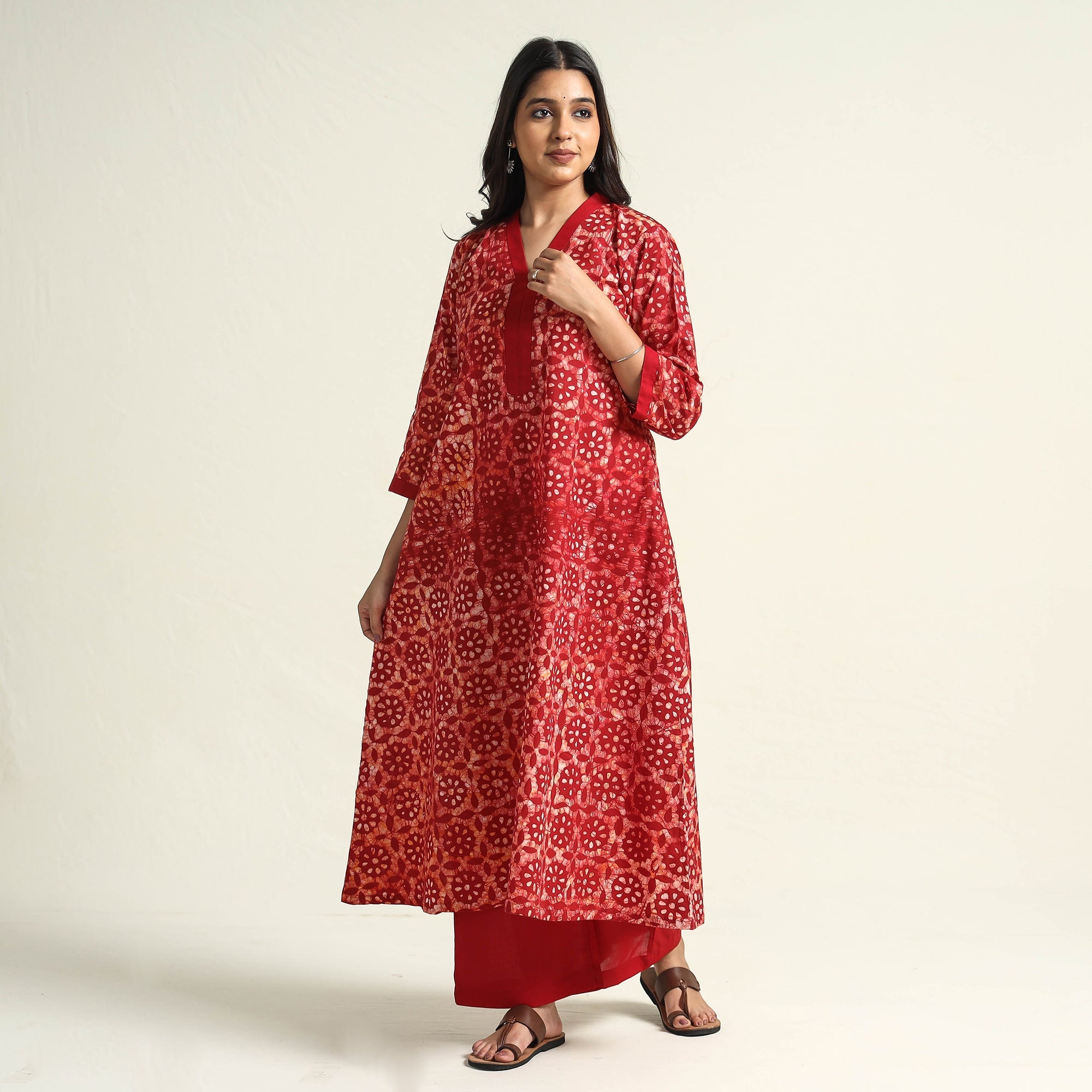 Look and feel beautiful in this uniquely designed hand batik printed cotton long kurta with plain palazzo set. This kurta set is crafted from cotton fabric, ensuring a comfortable feel against your skin. The kurta also features a convenient one-side pocket, perfect for carrying small essentials, and the palazzo features an elasticized waist and two side pockets, adding functionality to this palazzo. Perfect for special occasions and celebrations, this elegant kurta set exudes traditional charm with its hand-batik printed motifs.