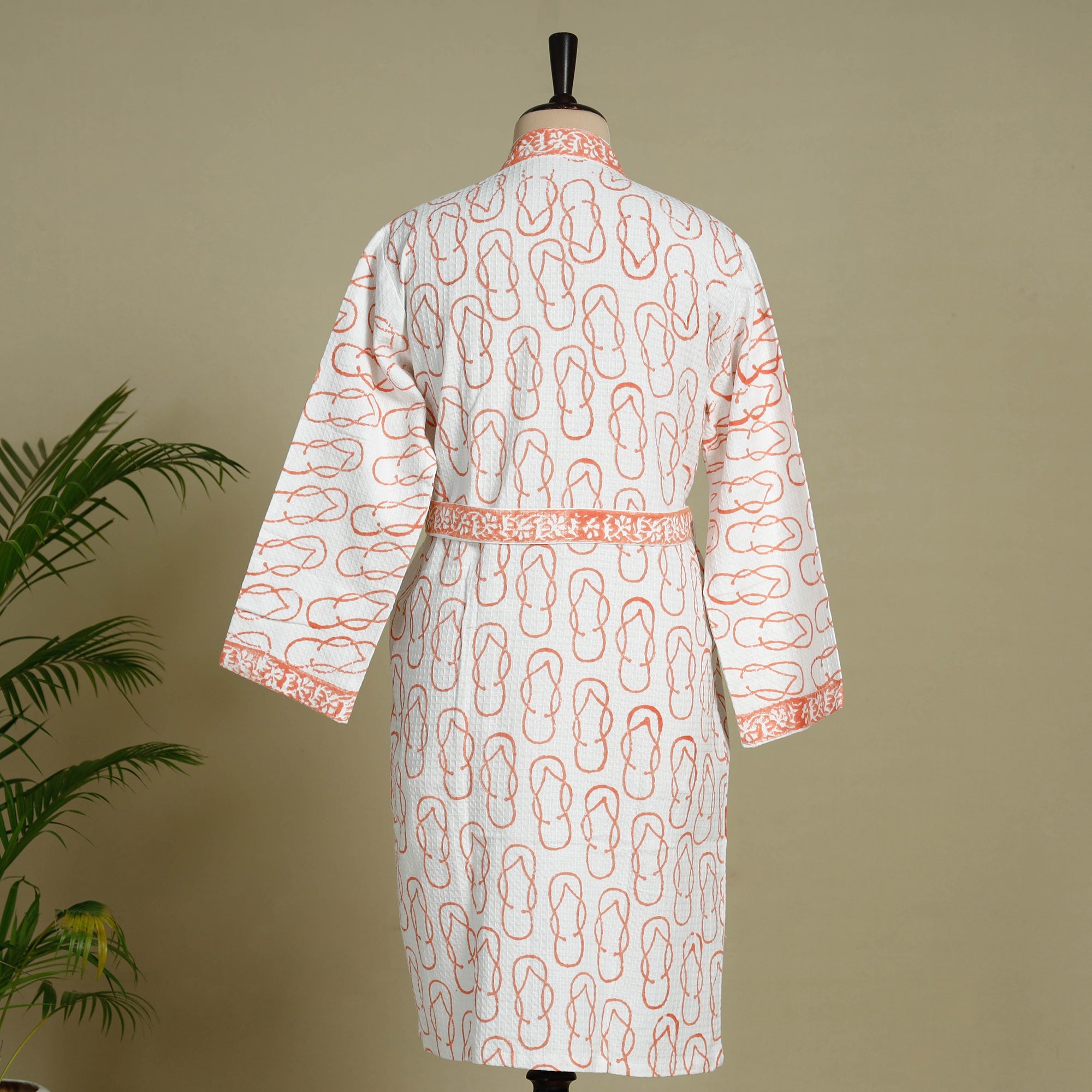 A waffle weave bathrobe is a luxurious addition to your bath time routine, and this one is made from fine quality handwoven cotton with a beautiful Sanganeri block print. The waffle weave texture is created using a 6-shaft weave, which enhances the fabric's water absorbency. The Sanganeri block print is a traditional hand-block printing technique originating from Sanganer, a village in Jaipur, Rajasthan, and is known for its intricate and vibrant designs. The VAT dyes used are bleed-free, ensuring the longevity of the beautiful print. Wrap yourself in comfort and style with this beautiful bathrobe.