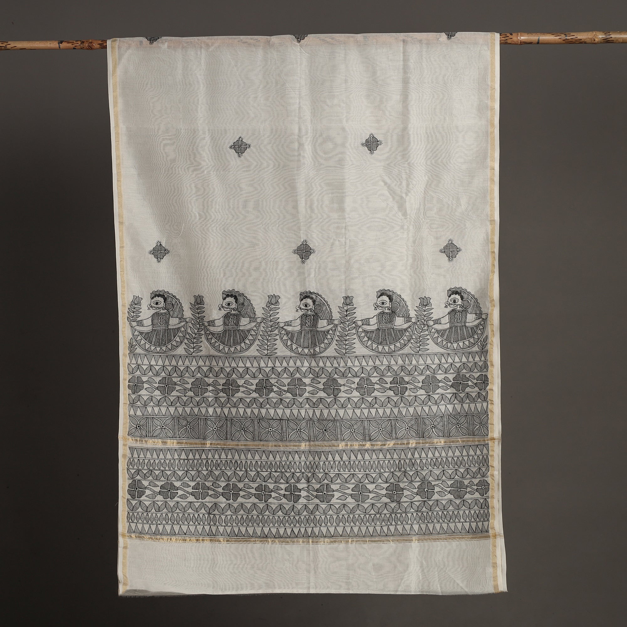 Finest pure handloom madhubani handpainted chanderi silk-cotton zari border dupatta is crafted from a blend of fine silk and cotton, known for its luxurious feel and lightweight texture. This dupatta is skillfully handpainted with intricate Madhubani artwork by master artisan Hira Devi from Bihar, showcasing the rich cultural heritage of the region.