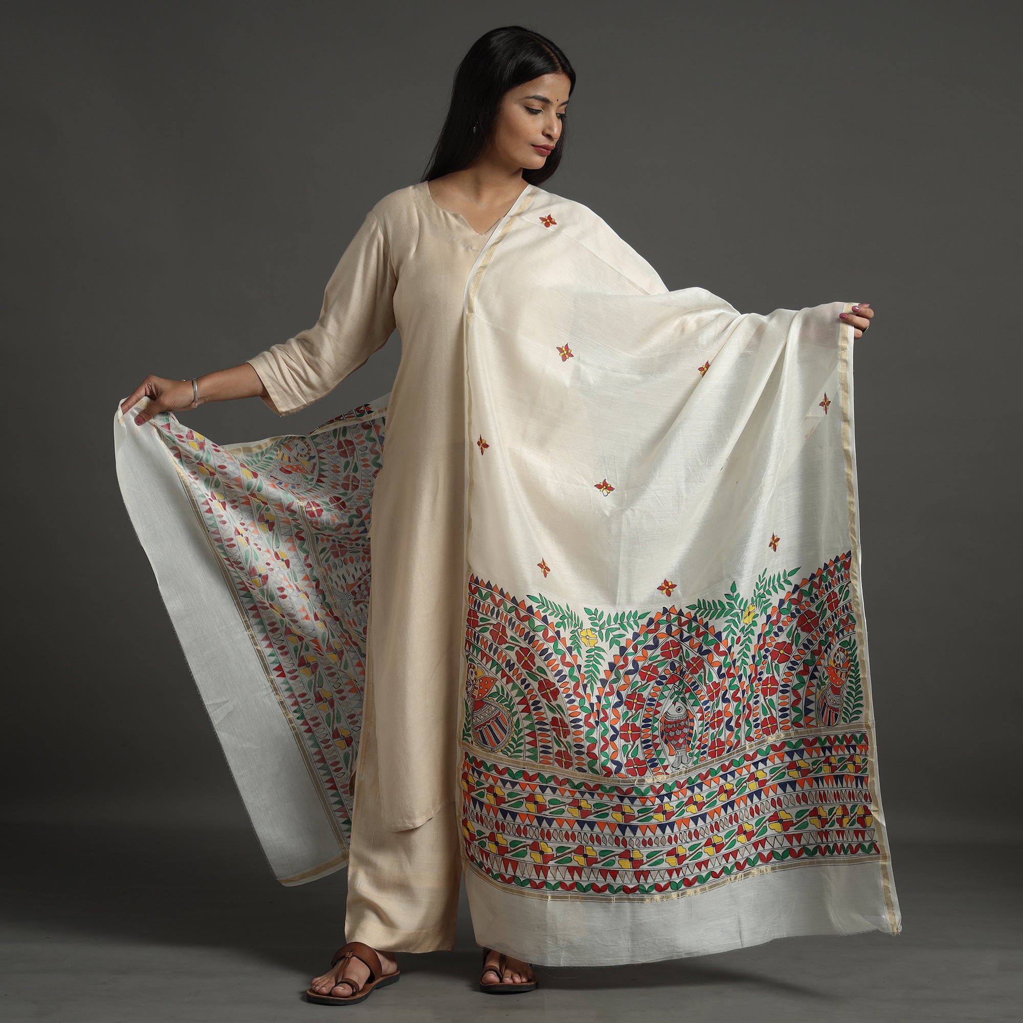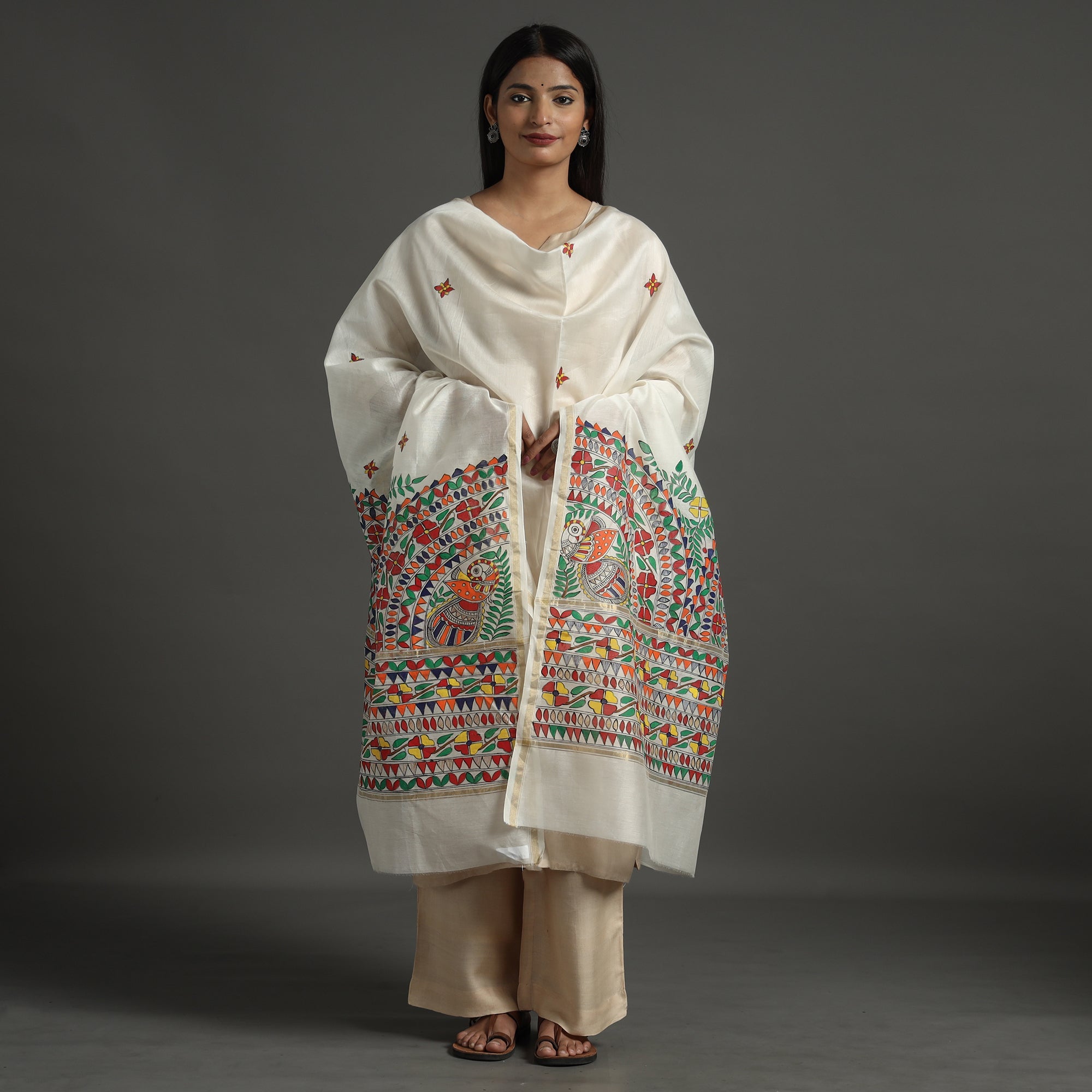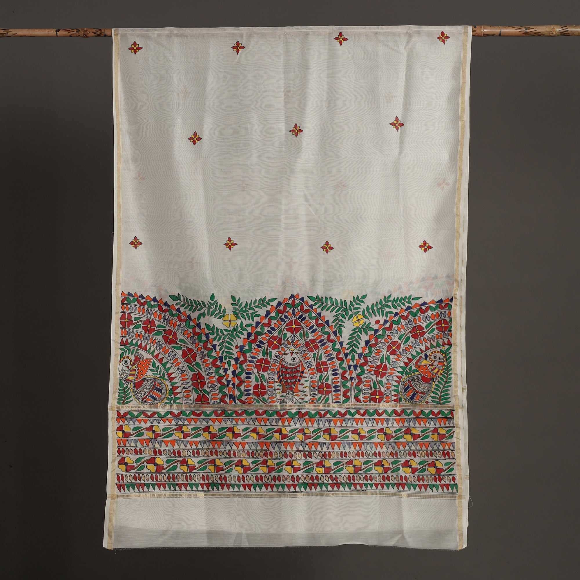 White - Handloom Chanderi Silk Handpainted Madhubani Dupatta 07