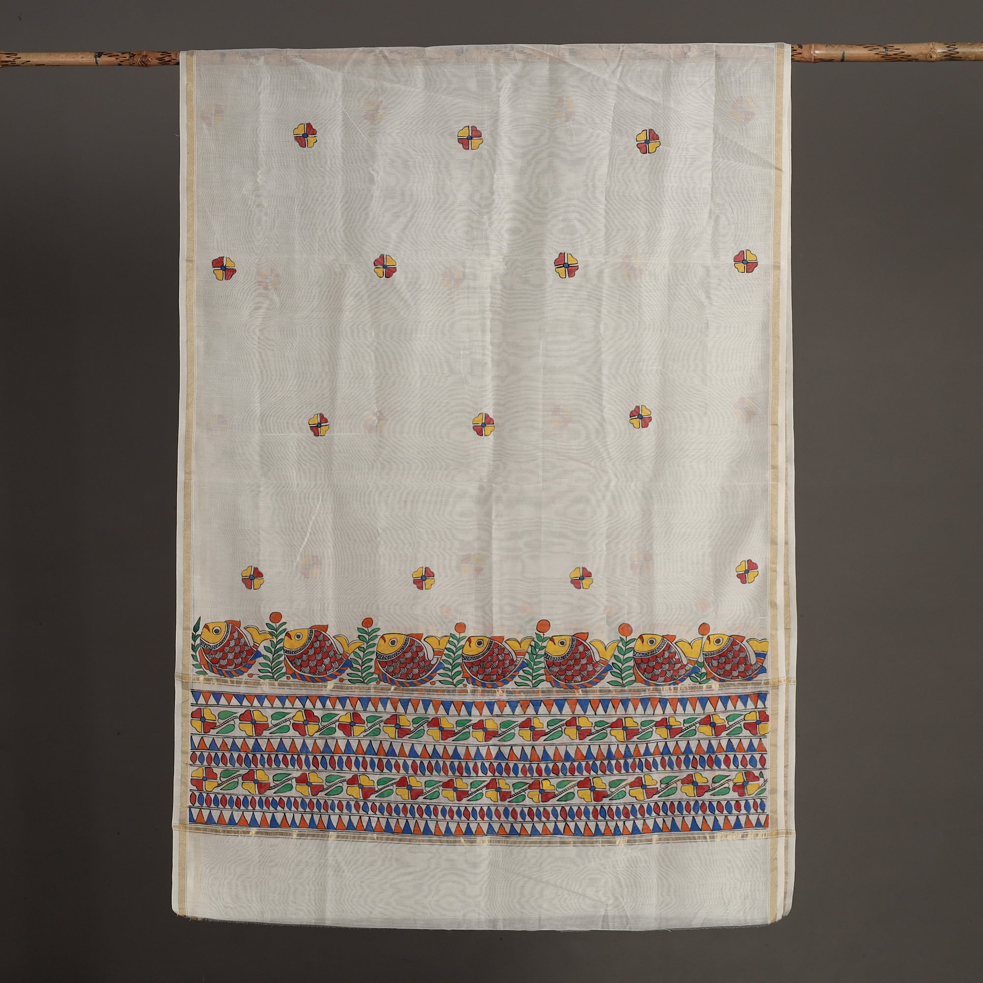 White - Handloom Chanderi Silk Handpainted Madhubani Dupatta 05