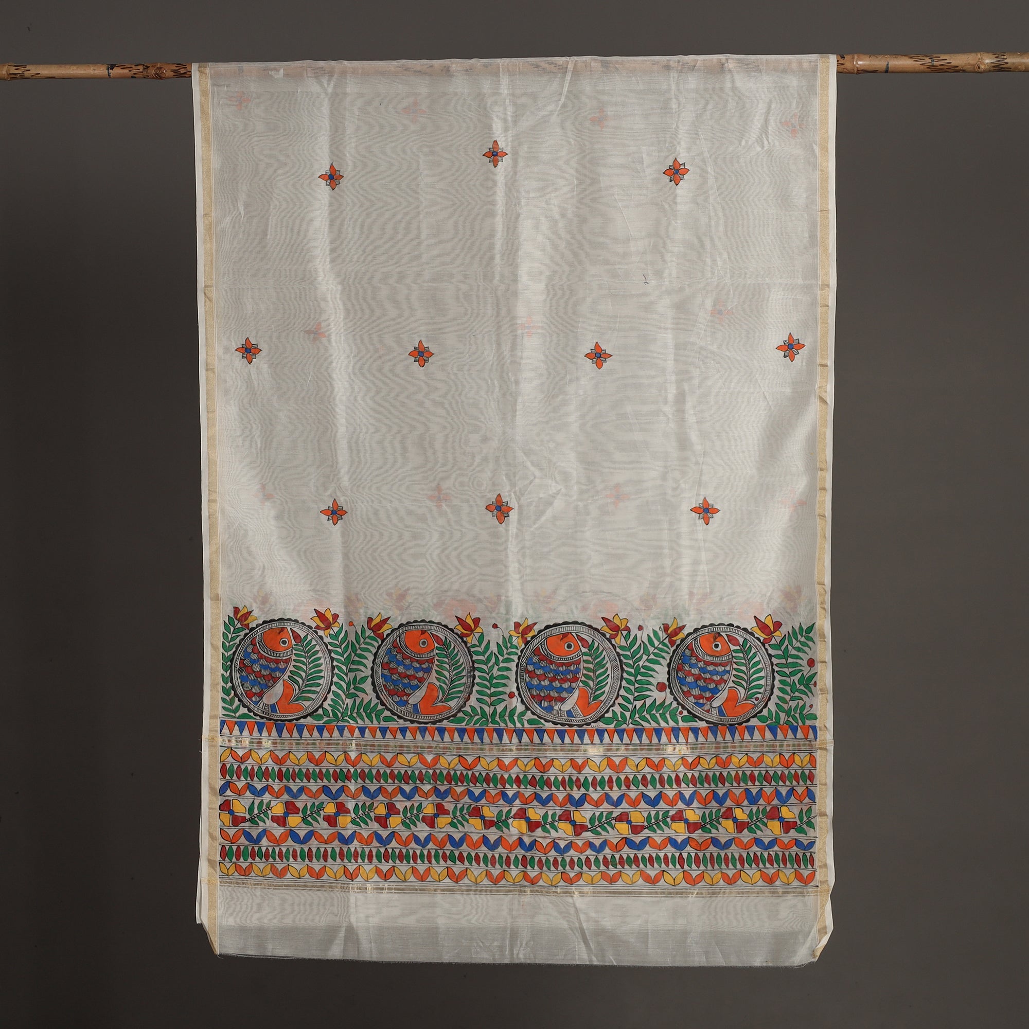 Finest pure handloom madhubani handpainted chanderi silk-cotton zari border dupatta is crafted from a blend of fine silk and cotton, known for its luxurious feel and lightweight texture. This dupatta is skillfully handpainted with intricate Madhubani artwork by master artisan Hira Devi from Bihar, showcasing the rich cultural heritage of the region.
