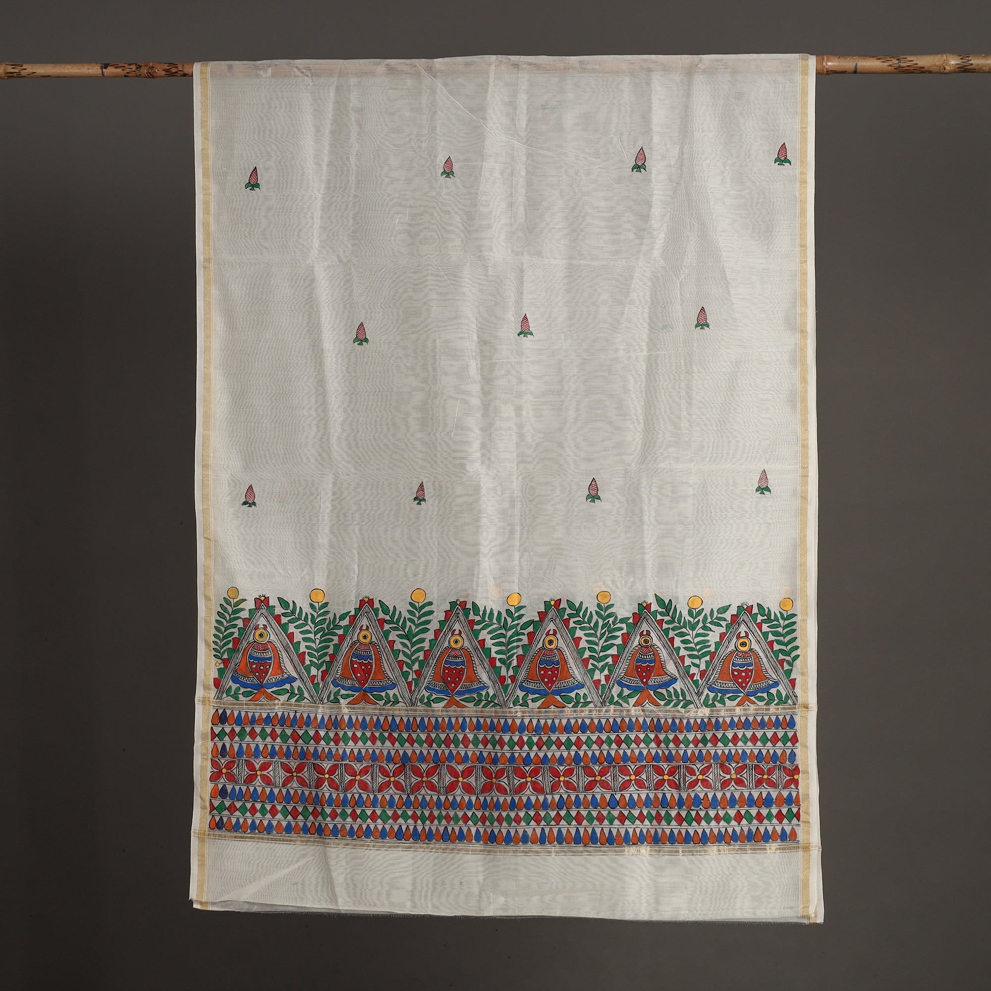 Finest white pure handloom madhubani handpainted chanderi silk-cotton zari border dupatta is crafted from a blend of fine silk and cotton, known for its luxurious feel and lightweight texture. This dupatta is skillfully handpainted with intricate Madhubani artwork by master artisan Hira Devi from Bihar, showcasing the rich cultural heritage of the region. Madhubani - Mithila Painting (also called Madhubani art or Mithila painting) is practiced in the Mithila region of India. Painting is done with fingers, twigs, brushes, nib-pens, and matchsticks, using fabric colours, and is characterised by eye-catching geometrical patterns.