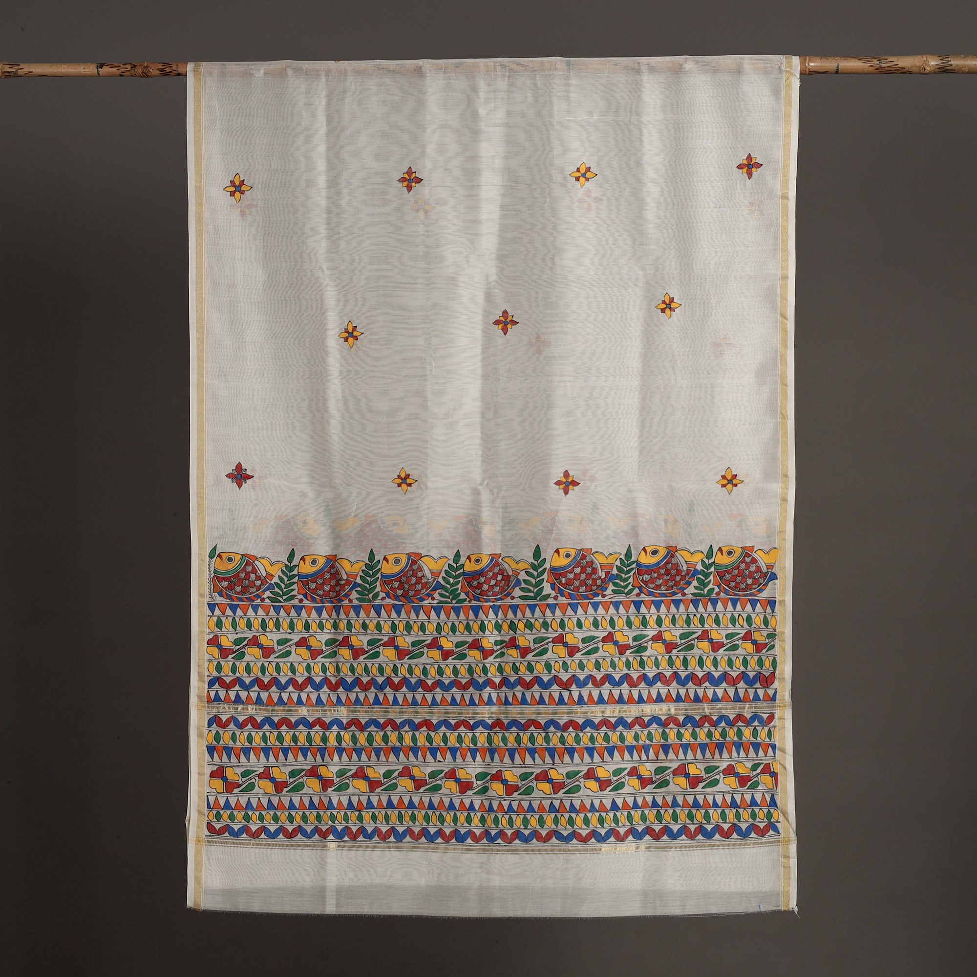 Finest pure handloom madhubani handpainted chanderi silk-cotton zari border dupatta is crafted from a blend of fine silk and cotton, known for its luxurious feel and lightweight texture. This dupatta is skillfully handpainted with intricate Madhubani artwork by master artisan Hira Devi from Bihar, showcasing the rich cultural heritage of the region.