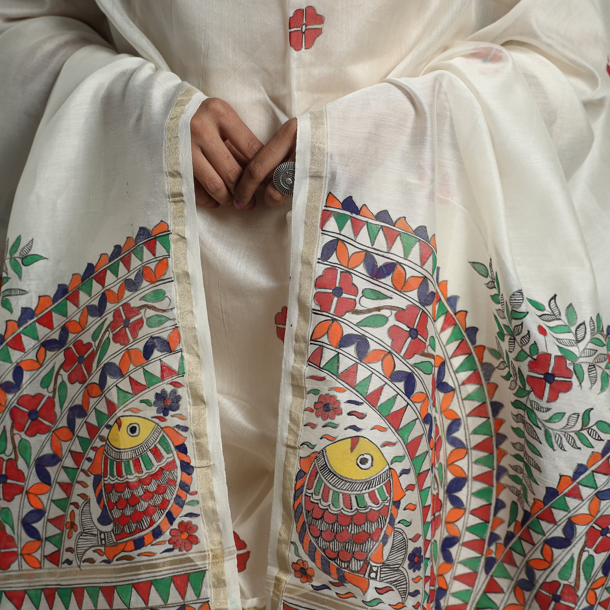 Finest pure handloom madhubani handpainted chanderi silk-cotton zari border dupatta is crafted from a blend of fine silk and cotton, known for its luxurious feel and lightweight texture. This dupatta is skillfully handpainted with intricate Madhubani artwork by master artisan Hira Devi from Bihar, showcasing the rich cultural heritage of the region.