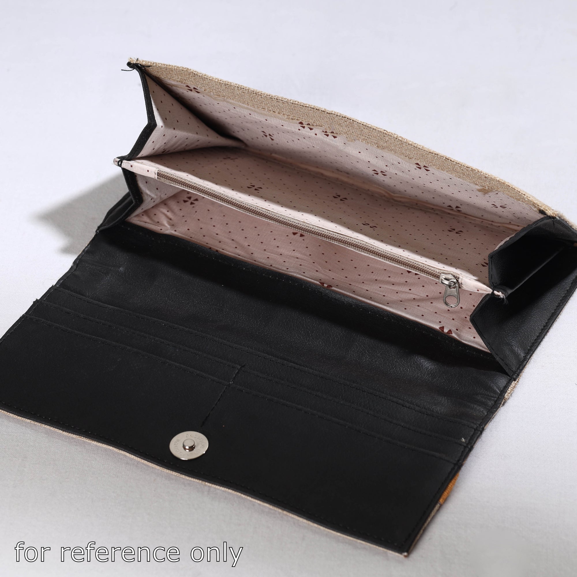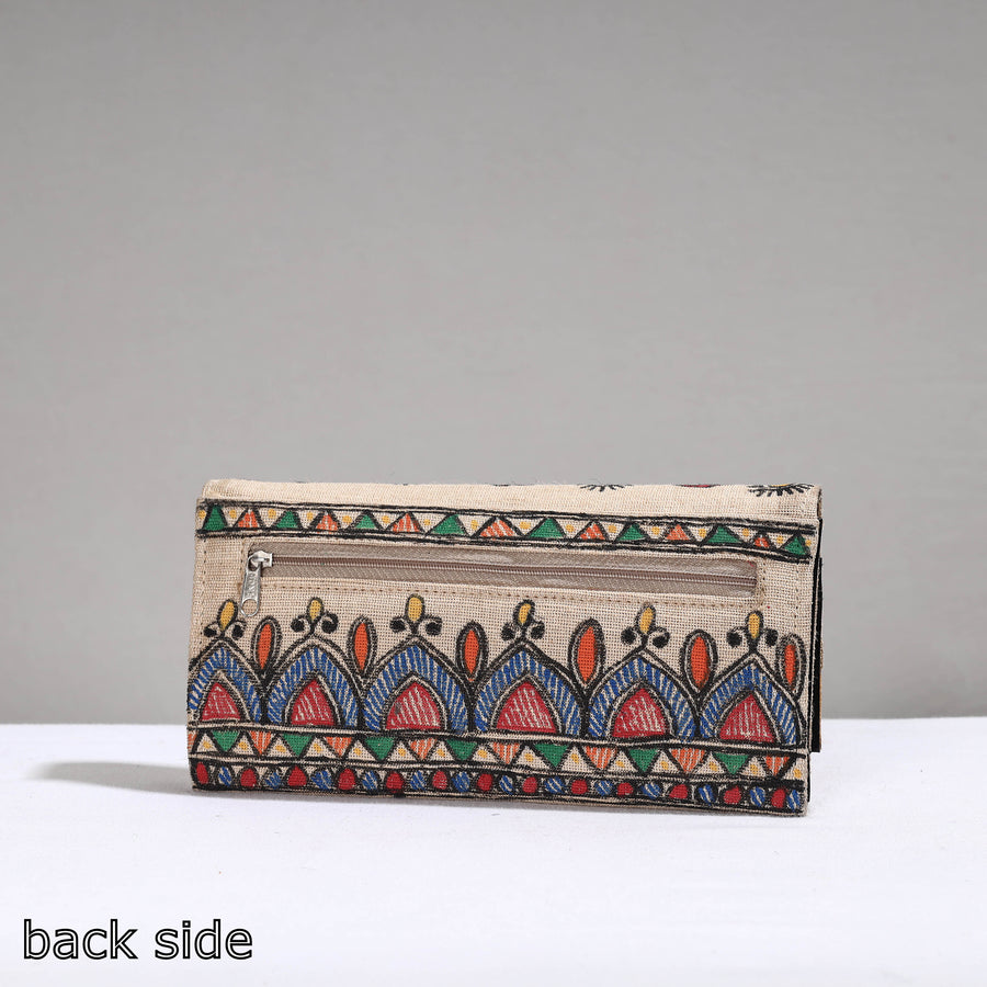 This madhubani multicolor clutch is made from jute cotton and handpainted with representations of traditional Mithila art by Ruchi Jha from Bihar. It has four card slots, one zipper and one simple pocket with spill-proof plastic layer lining inside & one zipper pocket on backside. Madhubani artworks are created using natural dye colours, with geometrical figures and vibrant colours being key elements.