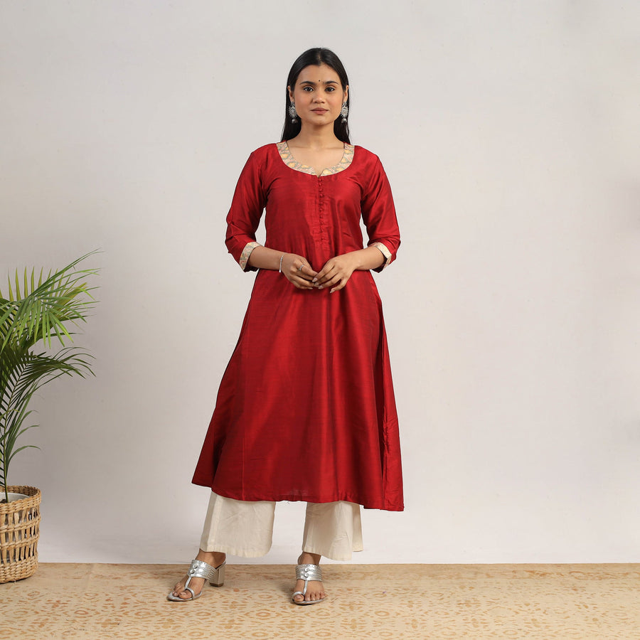 Look and feel beautiful in this uniquely designed red plain solid slub silk long kurta. This long kurta is crafted from high-quality slub silk fabric, ensuring a luxurious and comfortable feel against your skin. The kurta also features a convenient one-side pocket, perfect for carrying small essentials. It's an ideal choice for both casual and festive occasions.