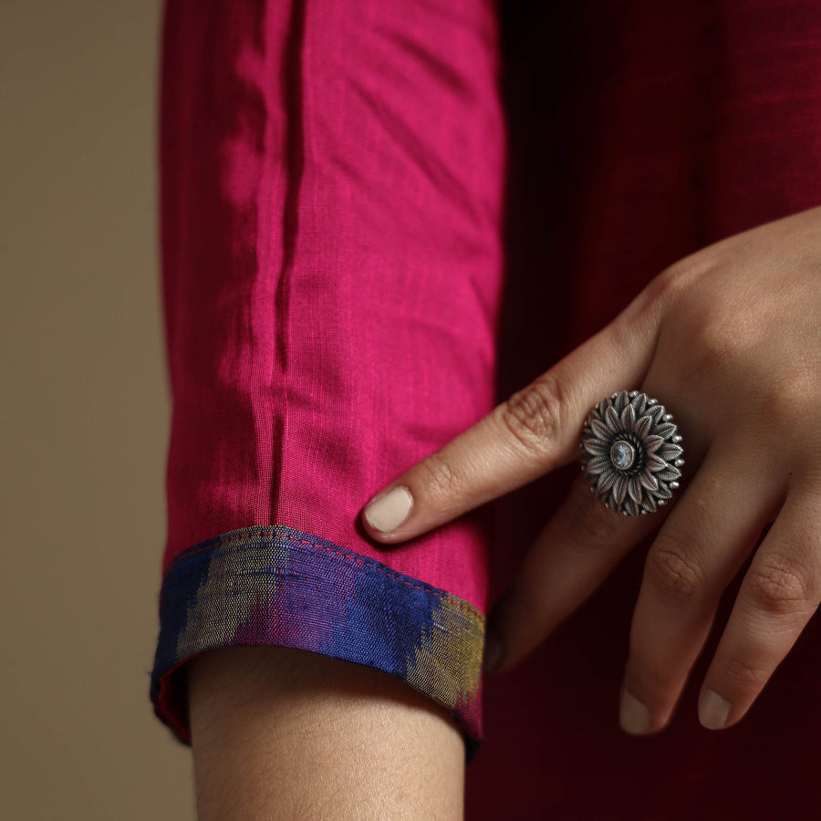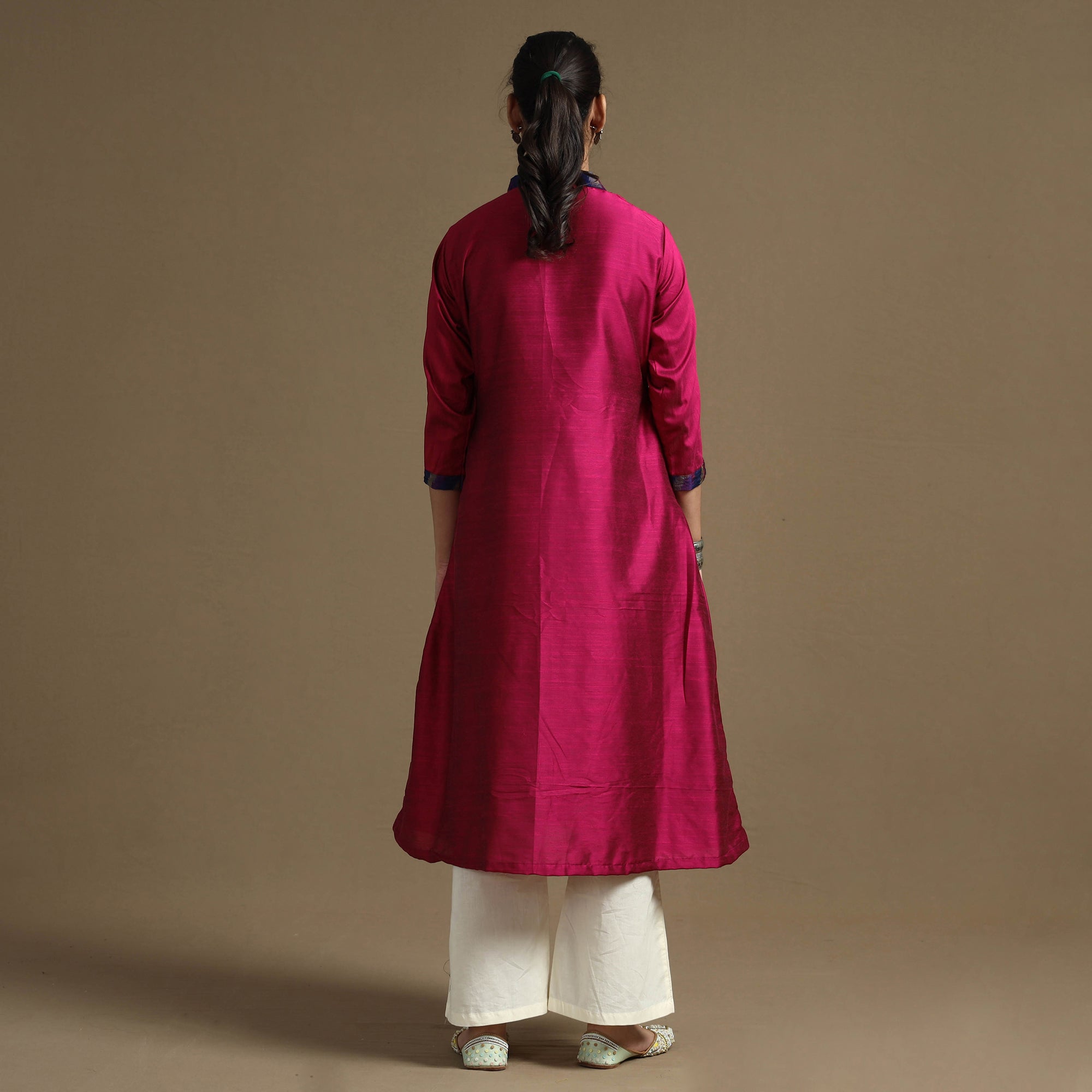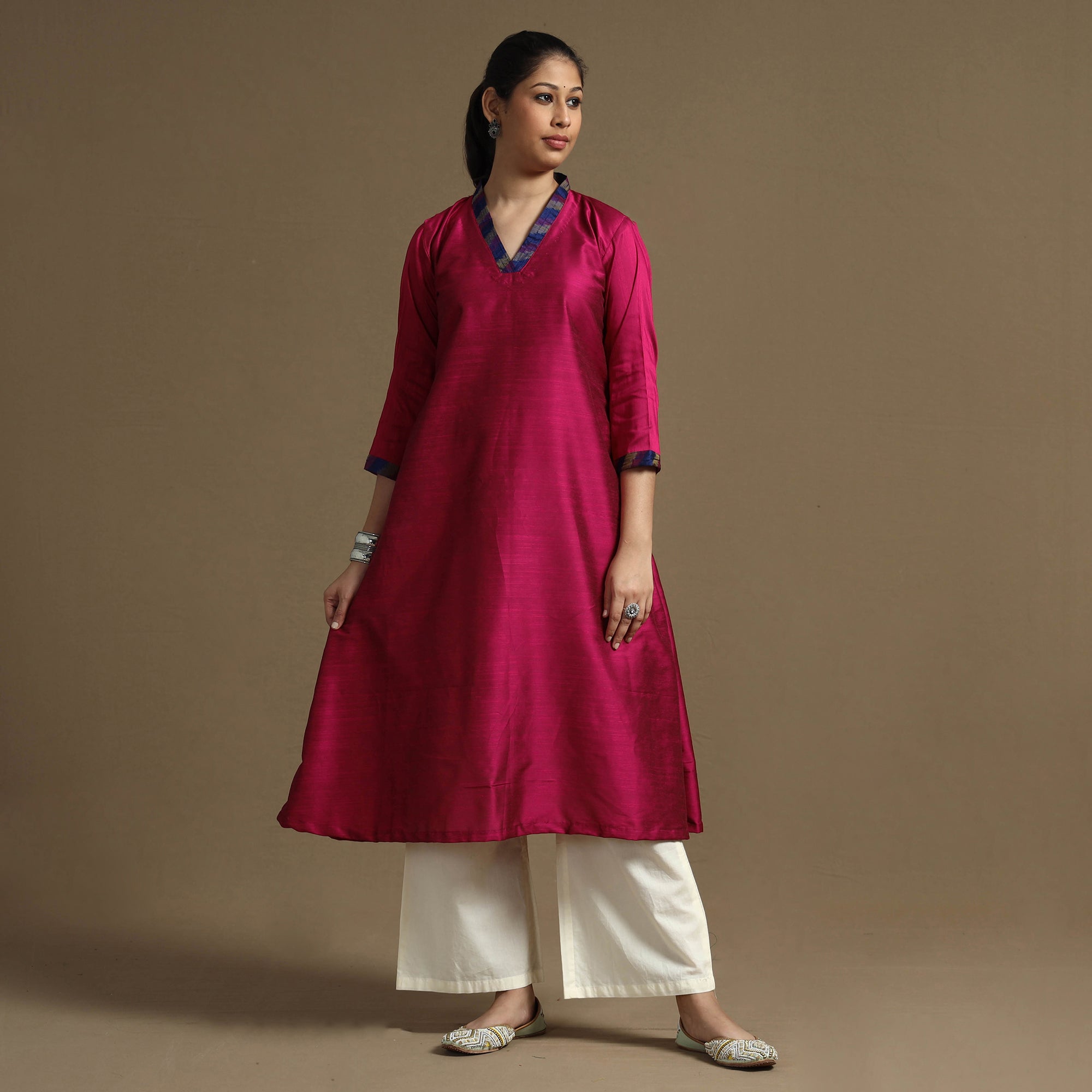 Look and feel beautiful in this uniquely designed plain solid slub silk long kurta. This long kurta is crafted from high-quality slub silk fabric, ensuring a luxurious and comfortable feel against your skin. The kurta also features a convenient one-side pocket, perfect for carrying small essentials. It's an ideal choice for both casual and festive occasions.