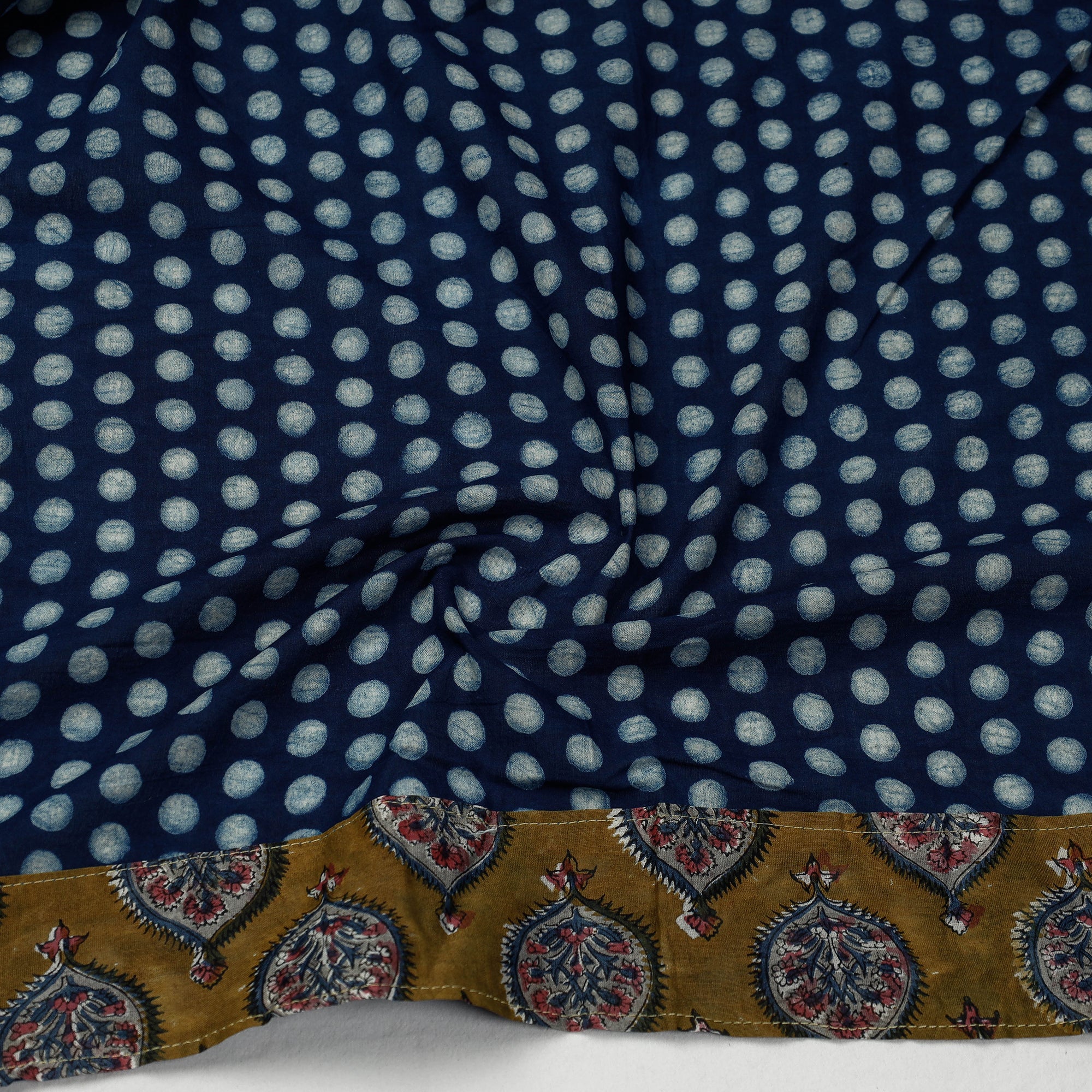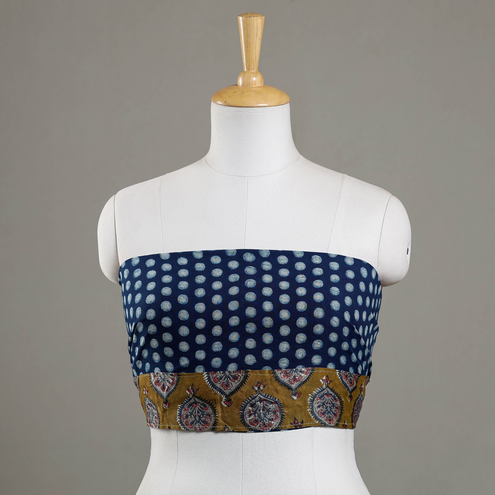 This indigo bagru block printed cotton blouse piece made from mix & matched cotton fabrics & textured with handmade textiles of India. This mix & match blouse material will go with almost all of your sarees & enhance your look.