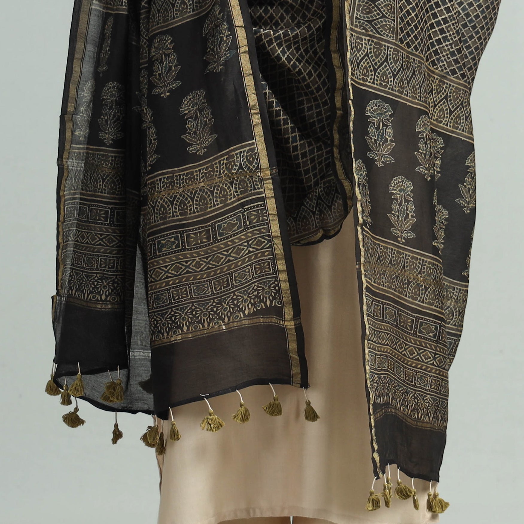 | Material | This exquisite brown ajrakh hand block printed chanderi silk dupatta is crafted with the finest quality chanderi silk fabric, ensuring a comfortable feel against your skin. Meticulously created using natural dyes through traditional ajrakh technique of hand block printing practised by the artisans in Kutch region of Gujarat. |